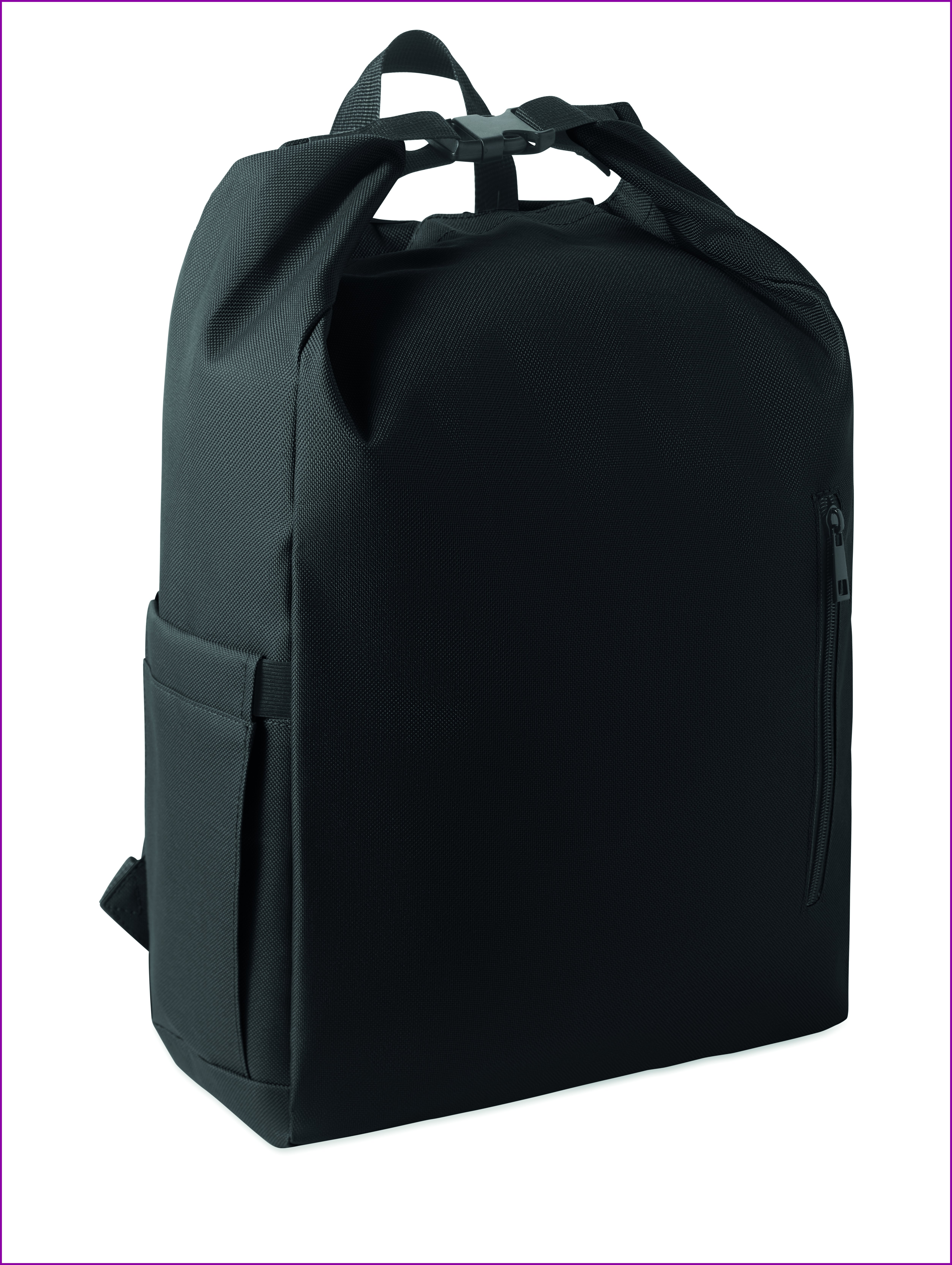 15'' rullattava läppärireppu, joka on valmistettu 600D RPET -polyesterikankaasta ja jossa on 210D RPET -pehmustettu vuori. Vetoketjullinen etutasku, joustava sivutasku ja säädettävät olkahihnat.