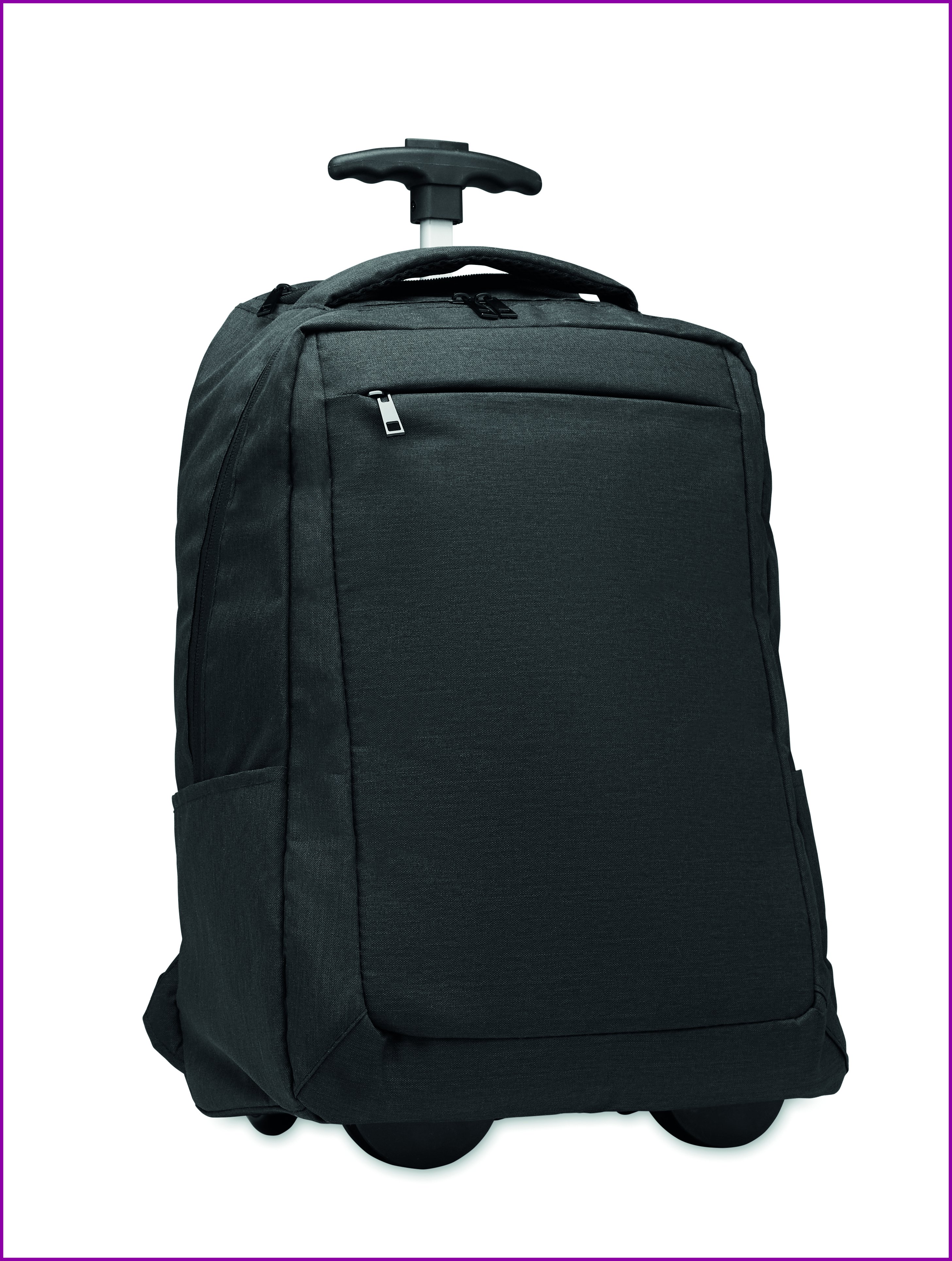 Pyörillä varustettu kannettava reppu 600D RPET-polyesteriä. Sisältää lokeron 15 tuuman kannettavalle tietokoneelle. Vetoketjullinen etutasku. Kaksi sivutaskua. Kolme sisäistä liukutaskua. Pehmustetut selkä- ja olkahihnat. 2 pyörää ja kaksinkertainen putkirunko.
