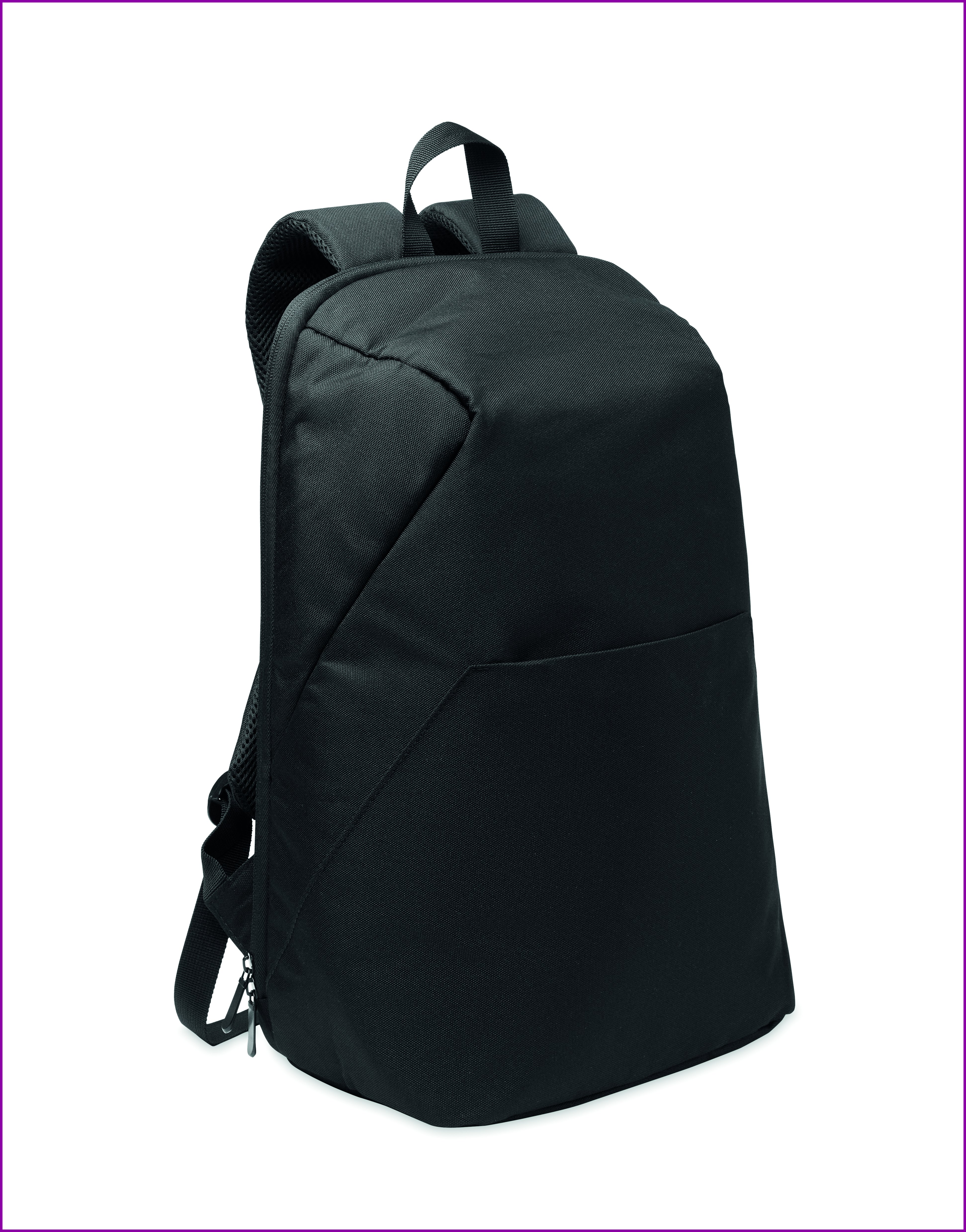 15 tuuman varkaudenestoinen läppärireppu 600D RPET -polyesteriä. Useita lokeroita, joista yksi on pehmustettu tabletille ja muille tavaroille. Pehmustetut olkahihnat ja päälokero takana.