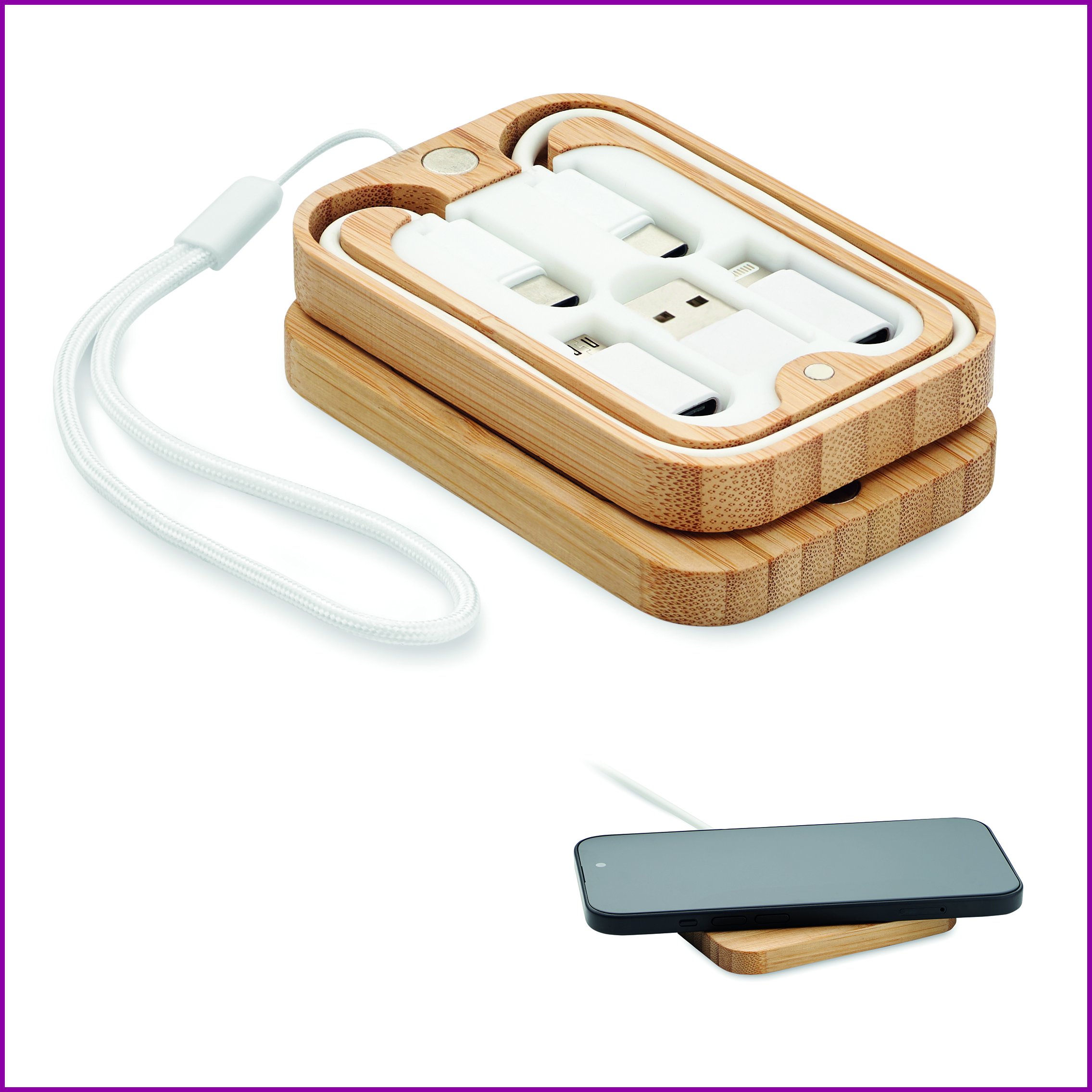 15W langaton laturi, jossa on 3-in-1-latauskaapeli, jossa on erilaisia liittimiä. Toimitetaan bambusta valmistetussa magneettisuljettavassa laatikossa, jossa on hihna. C-tyypin C-tyypin kaapeli, C-USB-A, C-micro-B, C-liittimet.