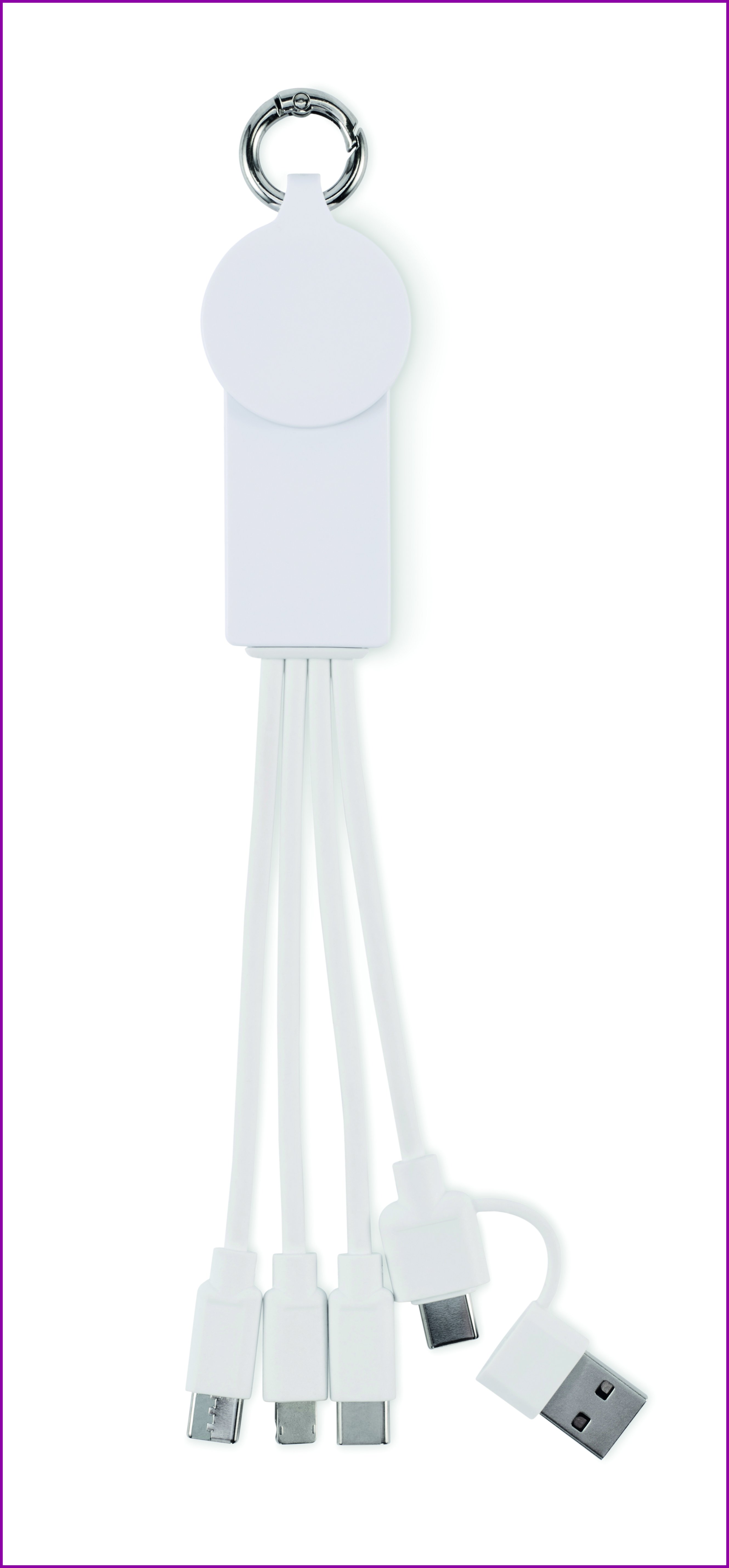 Avaimenperä latauskaapelilla, jonka tulo: 2-in-1 tyyppi-C ja tyyppi-A. Lähtö: (Samsung® ja Apple®), 2 x C-tyyppi ja micro-B (2 in 1 tappi). Kaapeli valmistettu kierrätetystä TPE:stä.