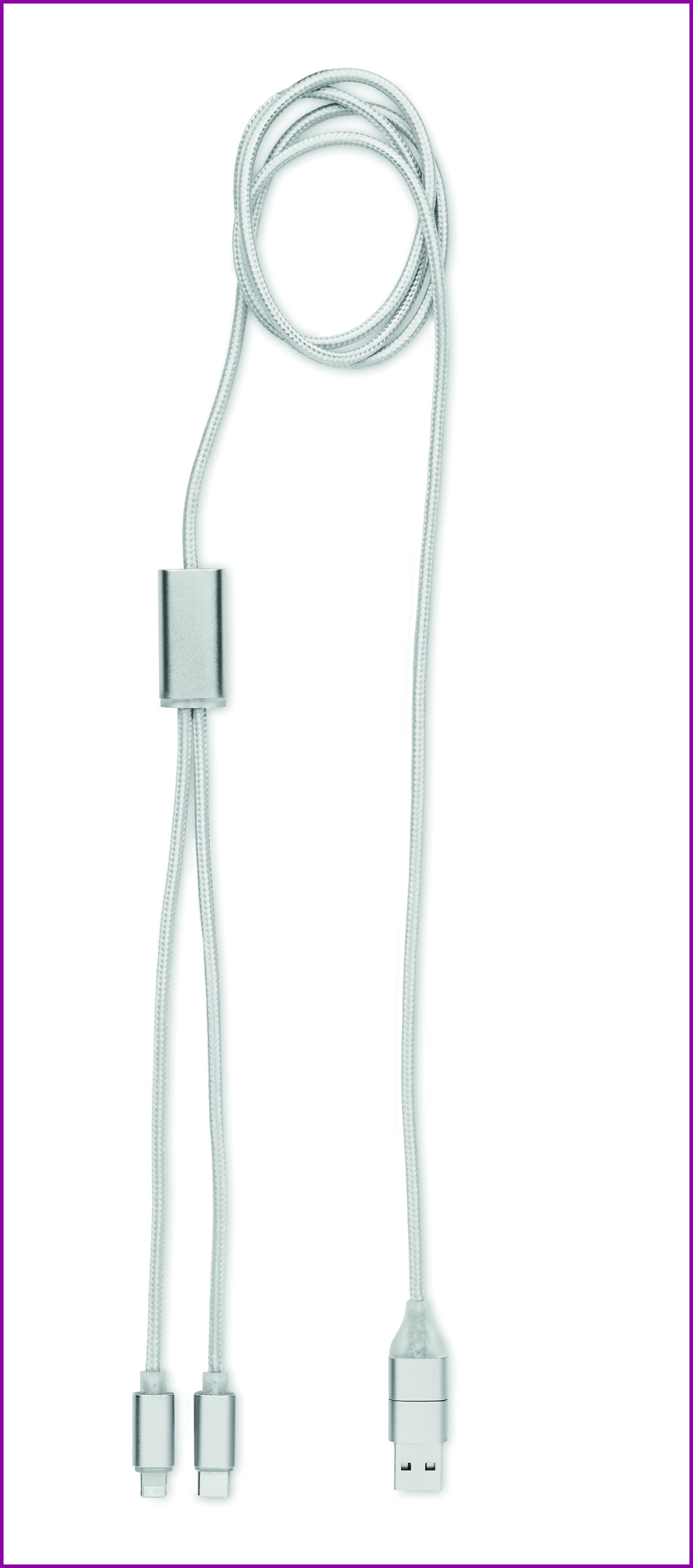 Latauskaapeli alumiinia, jossa tulo: 2-in-1 type-C & type-A ja micro-B (2 in 1 pin), C-tyypin ja micro B:n lähtö. Kaapelin pituus: 120 cm.
