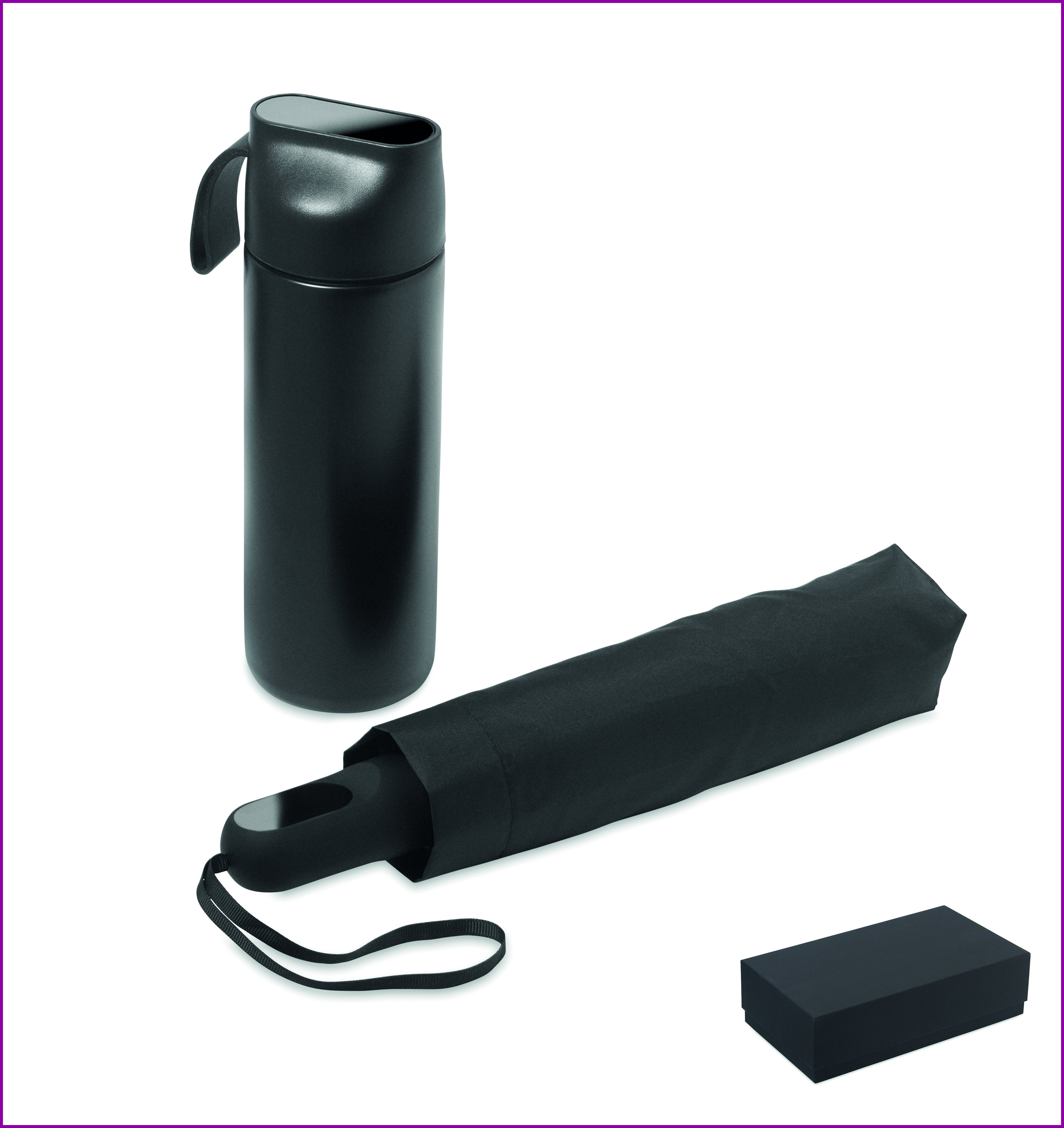 2-osainen lahjasetti: 600?ml kaksiseinäinen kierrätetty teräspullo PP-kannella, metalliyksityiskohdilla ja silikonikahvalla sekä 21'' taitettava tuulenpitävä pongeesateenvarjo ABS-kahva. Lahjarasiassa.