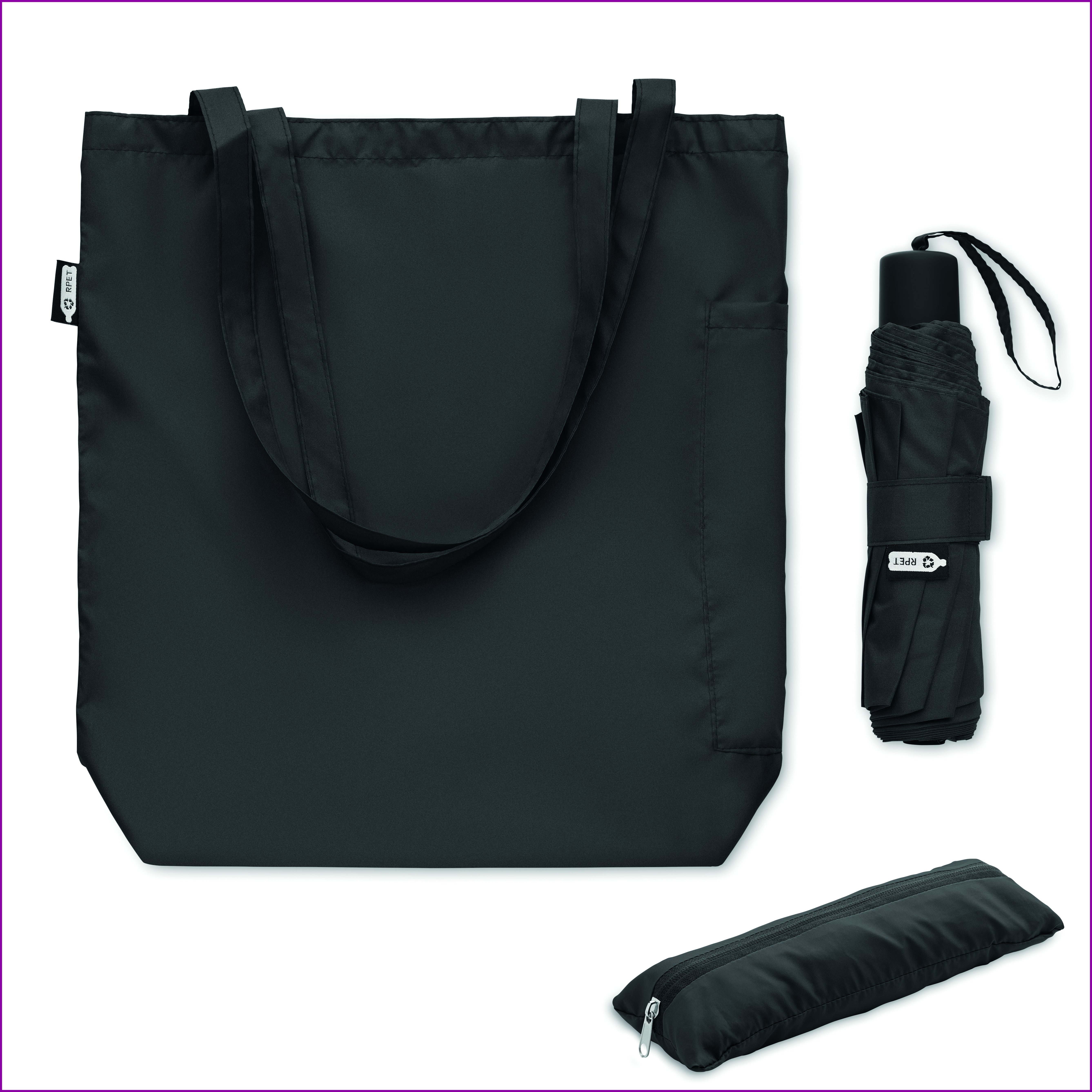21 tuuman manuaalisesti avattava ja suljettava tuulenpitävä sateenvarjo, valmistettu 190T RPET-pongeesta. Sisältää kantolaukkupussin. Sisältää piilotetun vetoketjullisen lokeron sateenvarjon säilyttämiseksi ja laukun sisällön pitämiseksi kuivana. Kun laukku ei ole käytössä, se rullautuu kokoon ja vetoketjulokero toimii sateenvarjon suojana.