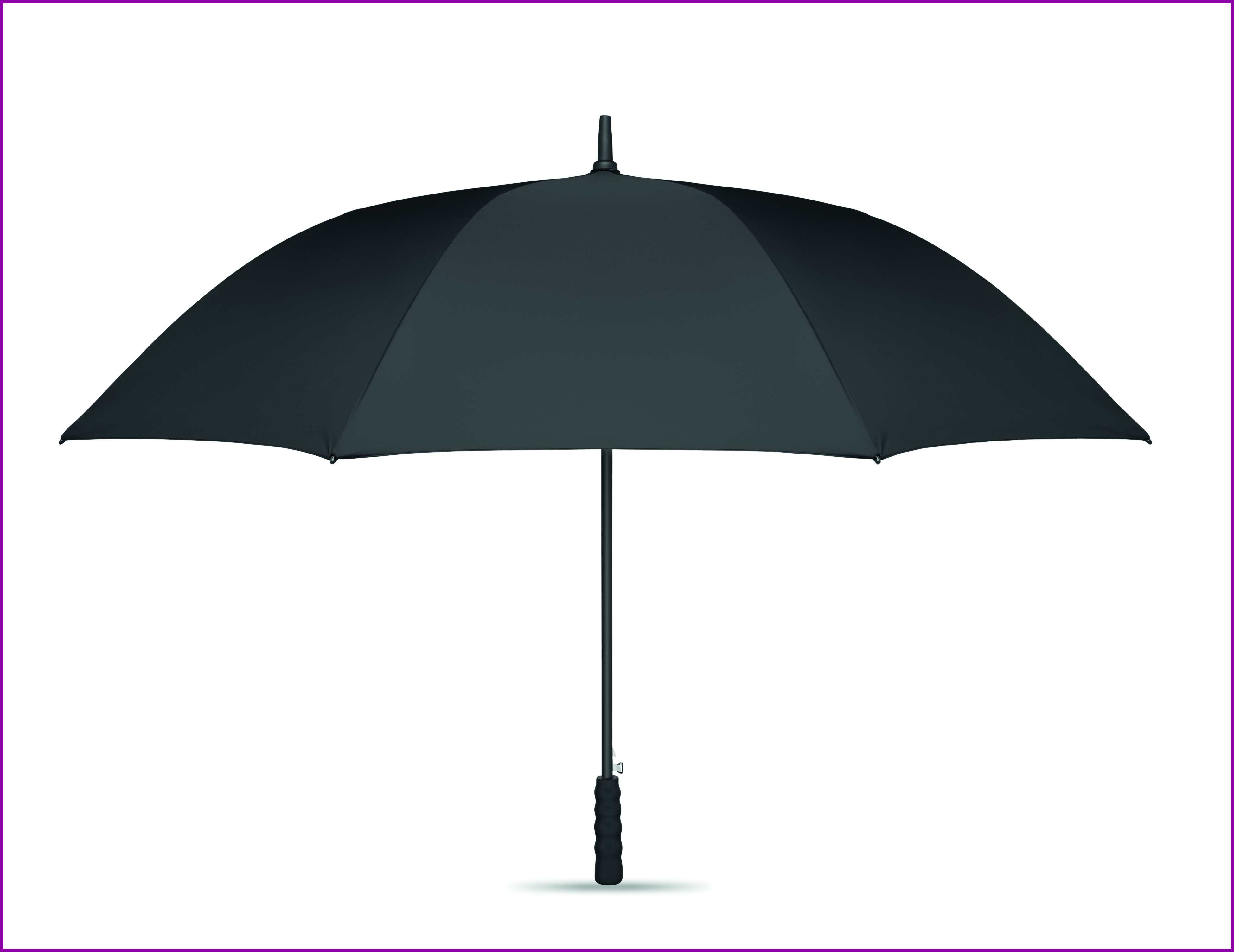 27 tuuman automaattisti avattava tuulenpitävä sateenvarjo 190T RPET pongeesta. Lasikuituinen varsi ja ruoteet. Vehmänolki-ABS Kierrätetty- kahva. Muoviset kärjet ja yläosa.