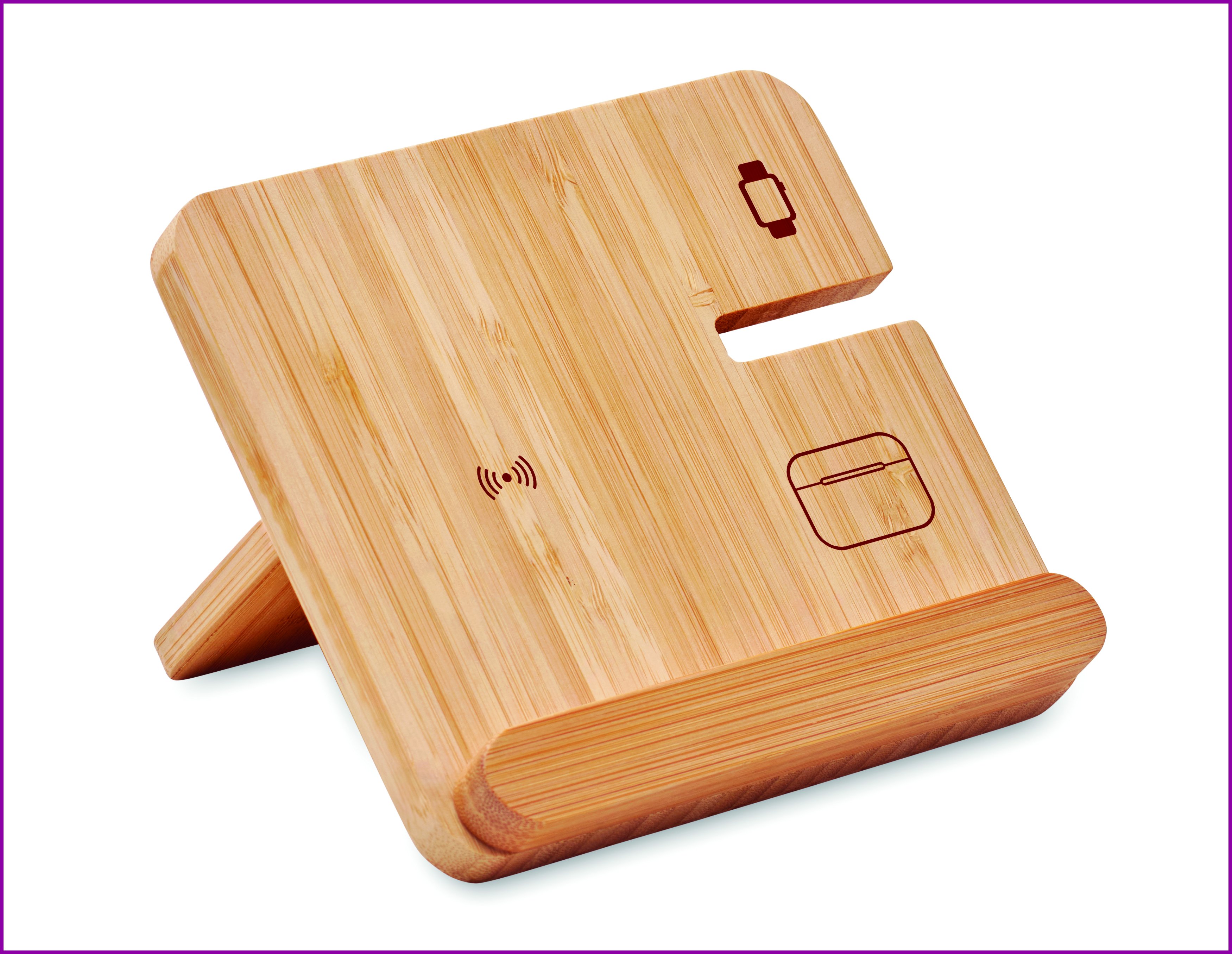 3 in 1 kokoontaitettava latausasema bambukotelossa ja puhelintelineessä. Se sisältää langattoman kaksoiskäämillisen 15 W:n laturin, älykellolaturin (vain Apple®) ja TWS-laturin.