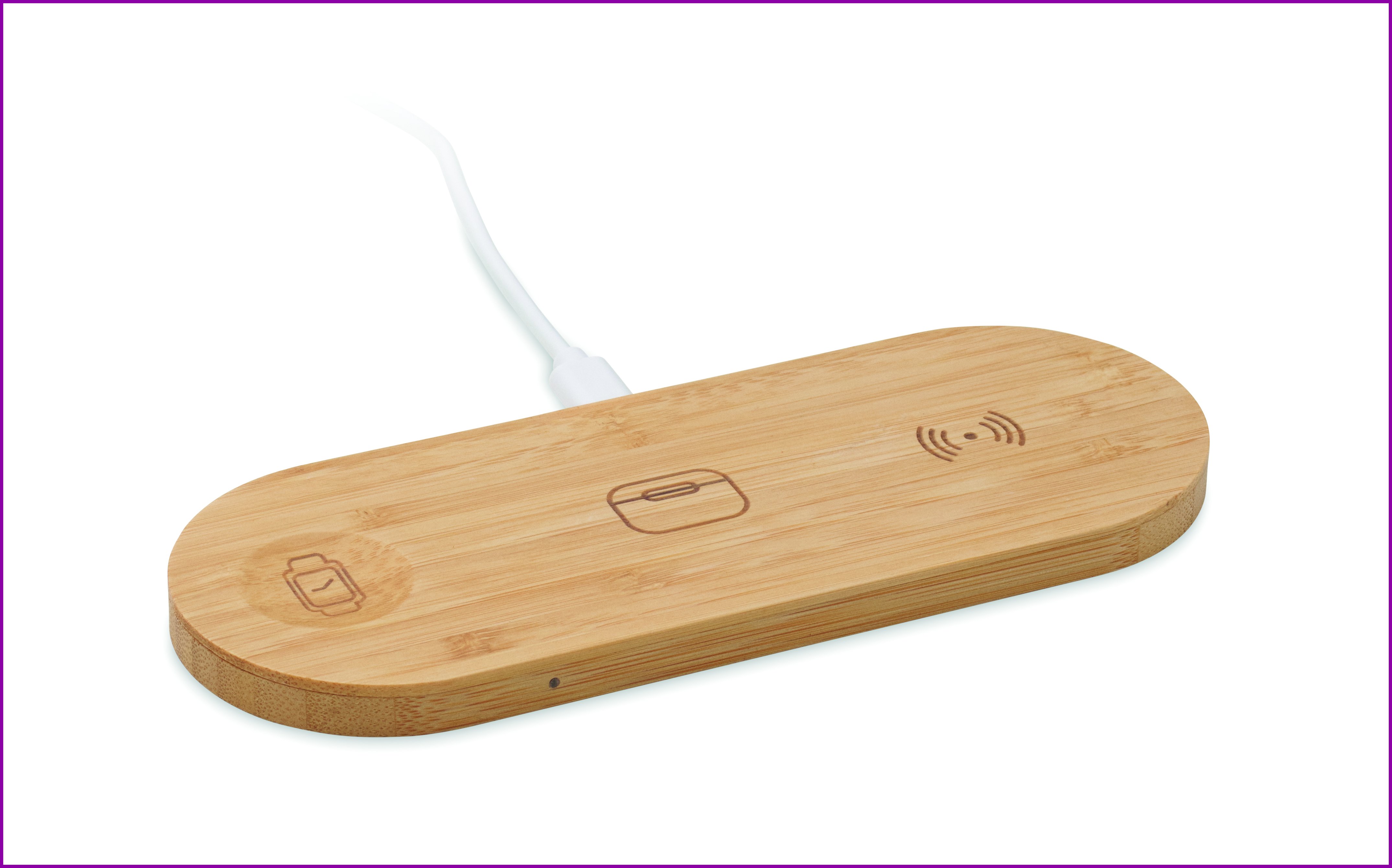 3-in-1-latausasema bambukotelossa. Sisältää langattoman laturin 15 W, älykellolaturin (vain Apple®) ja TWS-laturin.