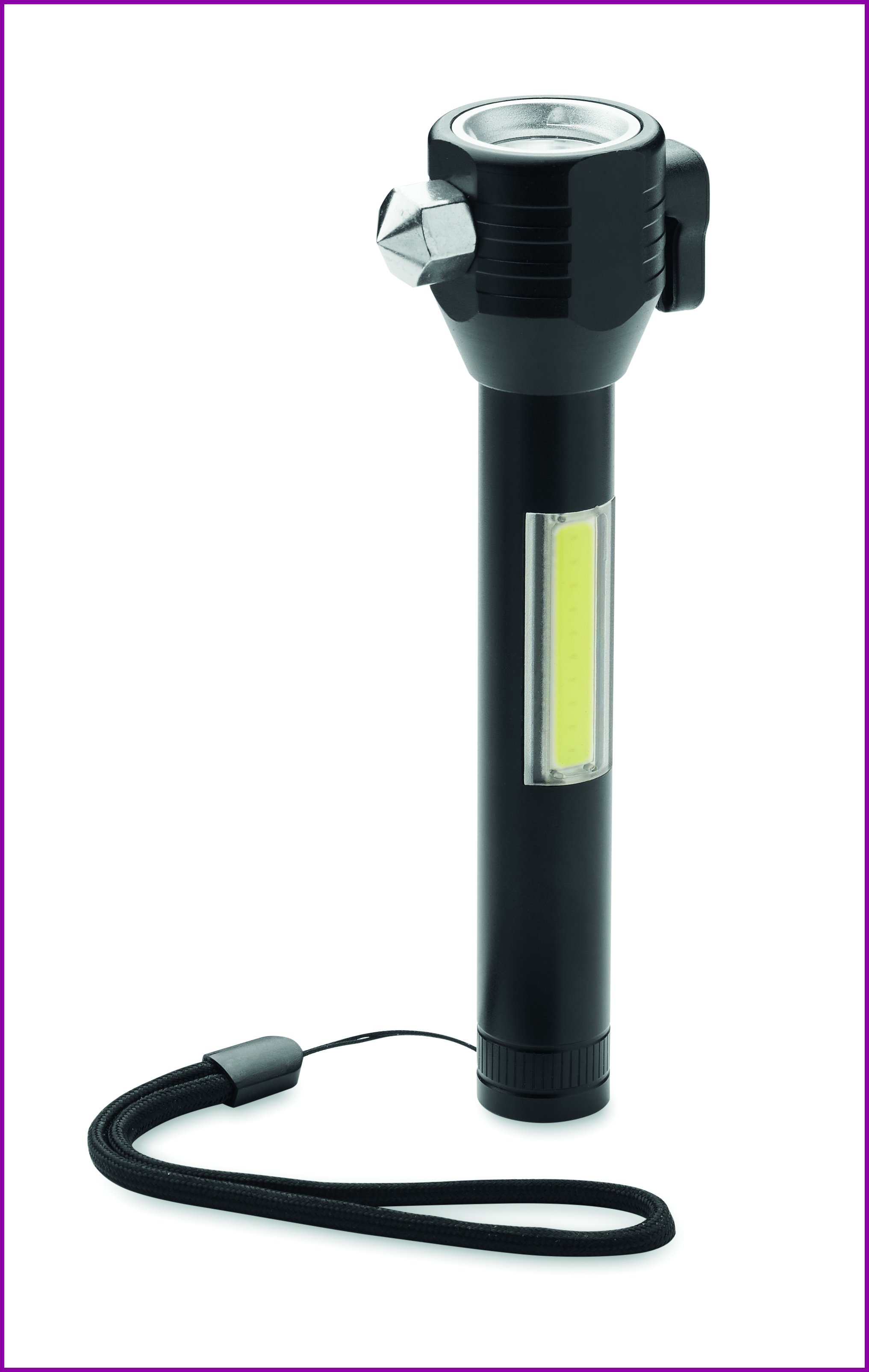 3 in 1 alumiininen taskulamppu hätävasaralla ja turvavyöleikkurilla. Siinä on COB-valo sivulla ja edessä. Sisältää magneetin ja käsihihnan. Mukana sisäänrakennettu ladattava 500 mAh akku.