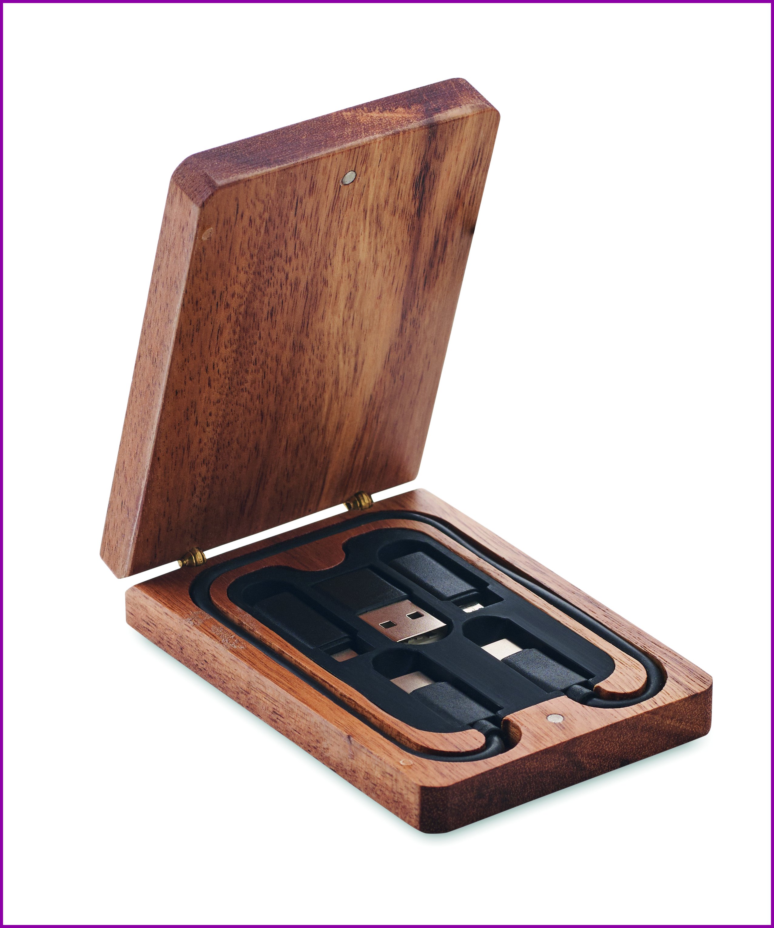 3-in-1-latauskaapeli eri liittimillä. Toimitetaan akaasiapuulaatikossa. C-to C-tyypin kaapeli, C-USB-A, C-micro-B, C-Lightning-liittimiin.