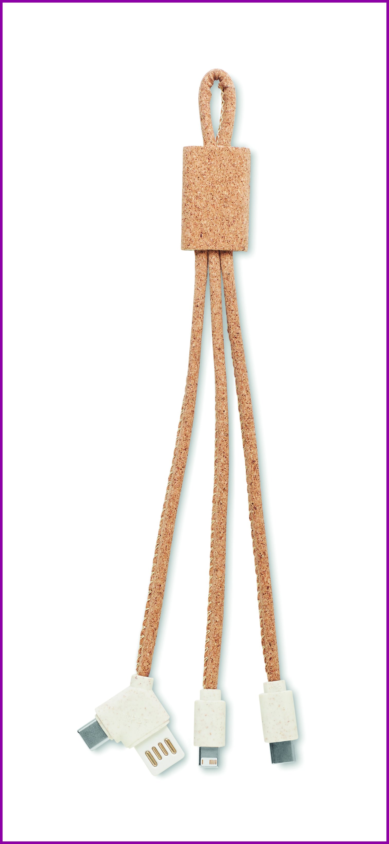 -3-in-1 -latauskaapeli korkkia. Tulo A-tyypin ja C-tyypin liitännällä, lähtö kolmella eri tyypin liitännällä, A-, B- C-tyyppi. Korkki on luonnonmateriaali, strukturaalinen laatu ja pinnan huokoisuus voi aiheuttaa eroavaisuuksia tuotteissa painatuksen jälkeen.