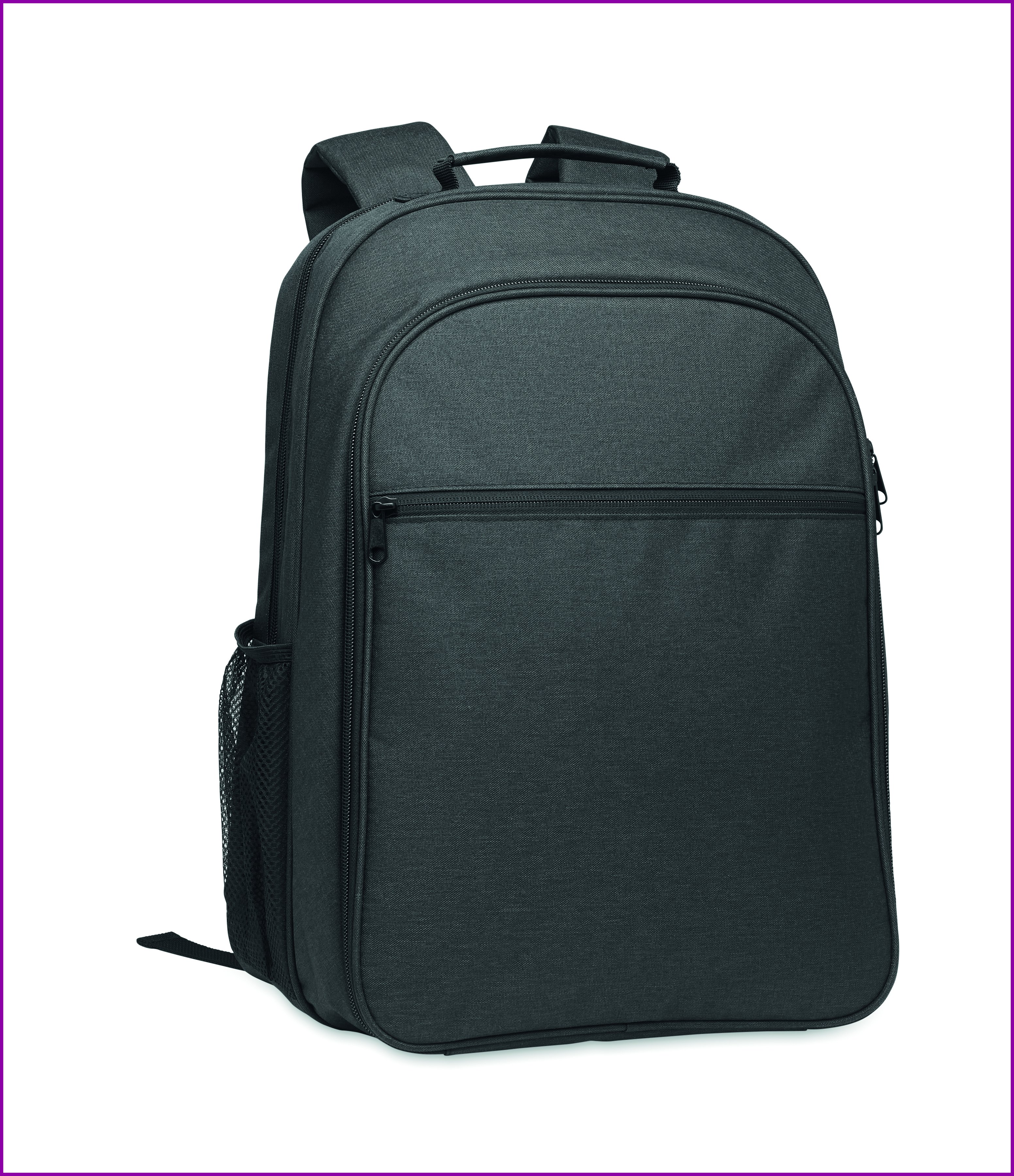 300D RPET-jäähdytysreppu, jossa on 15 tuuman kannettavan tietokoneen lokero. Vetoketjullinen etutasku ja yksi sivussa oleva verkkolokero.