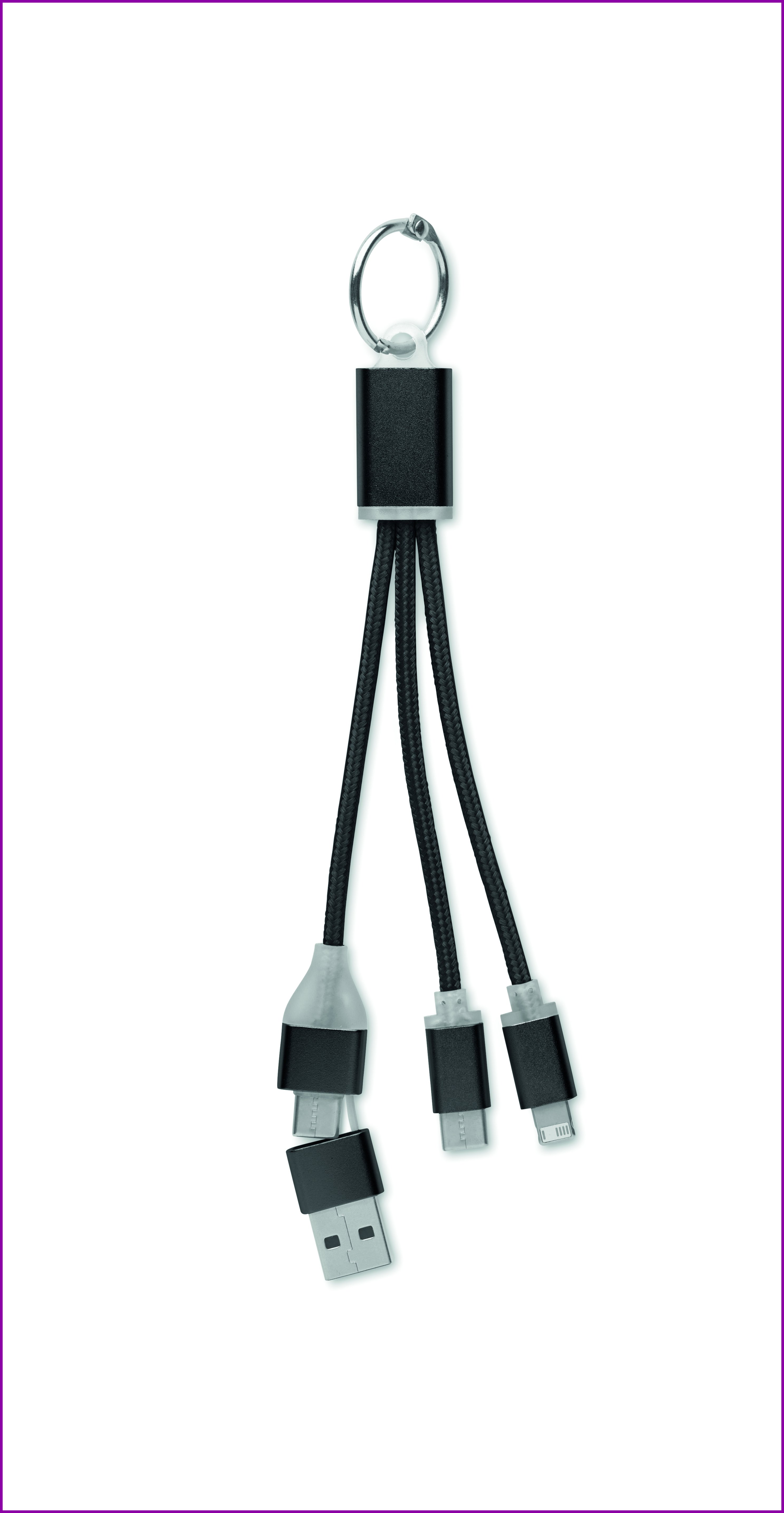 Avaimenperä latauskaapelilla, jossa on tulo: 2-in-1 tyyppi-C & tyyppi-A ja micro-B (2 in 1 pin) ja tyyppi-C-lähtö.