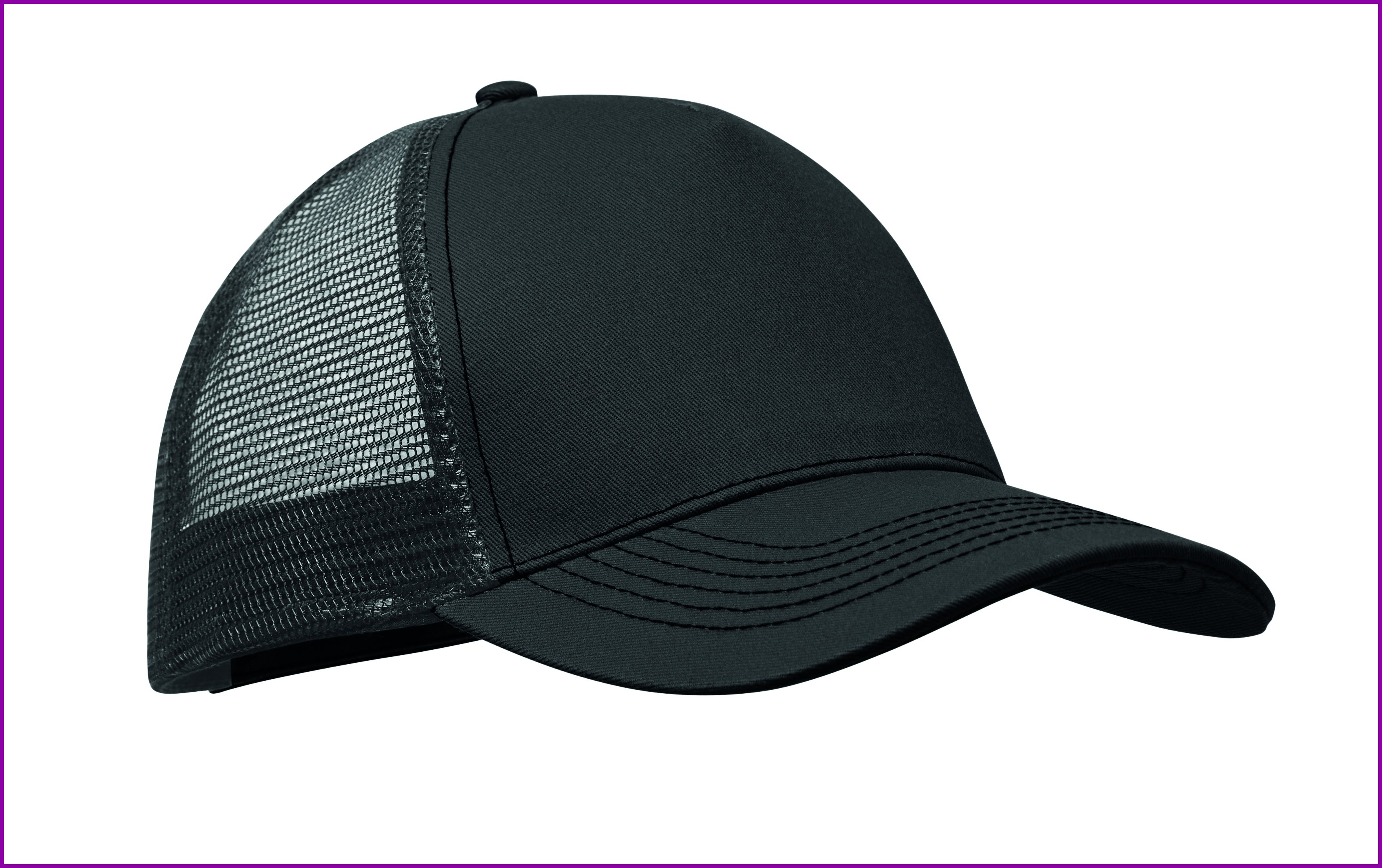5-paneelinen trucker-lippis, jossa etupaneeli ja visiiri 250 gr/m² puuvillaa, takapaneeli polyesteriä, tarrakiinnitys.