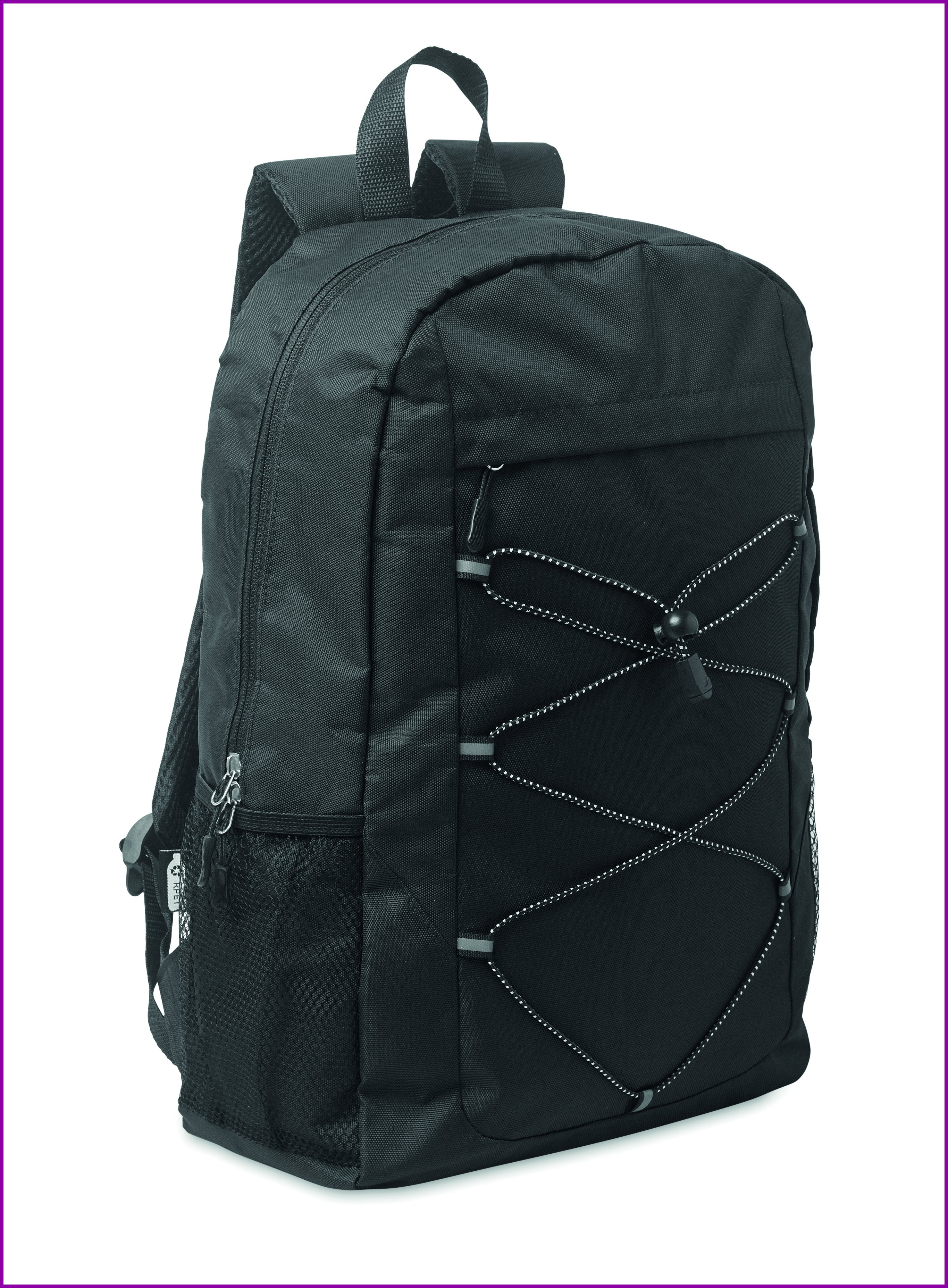 Reppu 600D RPET-polyesteristä koristenauhalla ja vetoketjullisella etupaneelilla. Verkkotaskut molemmilla puolilla.