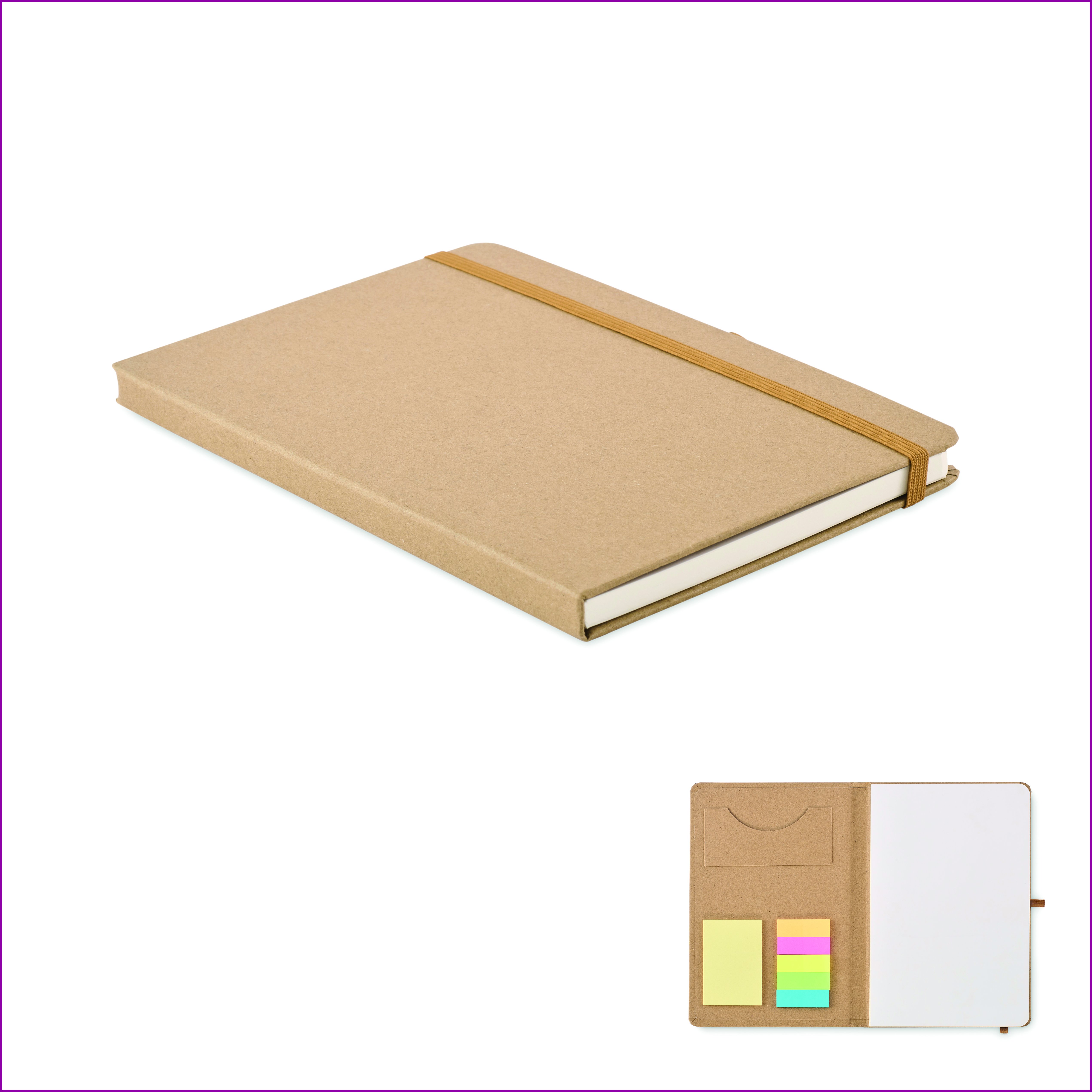 A5-kokoinen vihko, jossa on pahvikansi, 80 arkkia kierrätyspaperia (160 sivua), 25 arkkia muistilappuja ja 25 muistilappua. Joustava sulkuhihna ja kynälenkki.