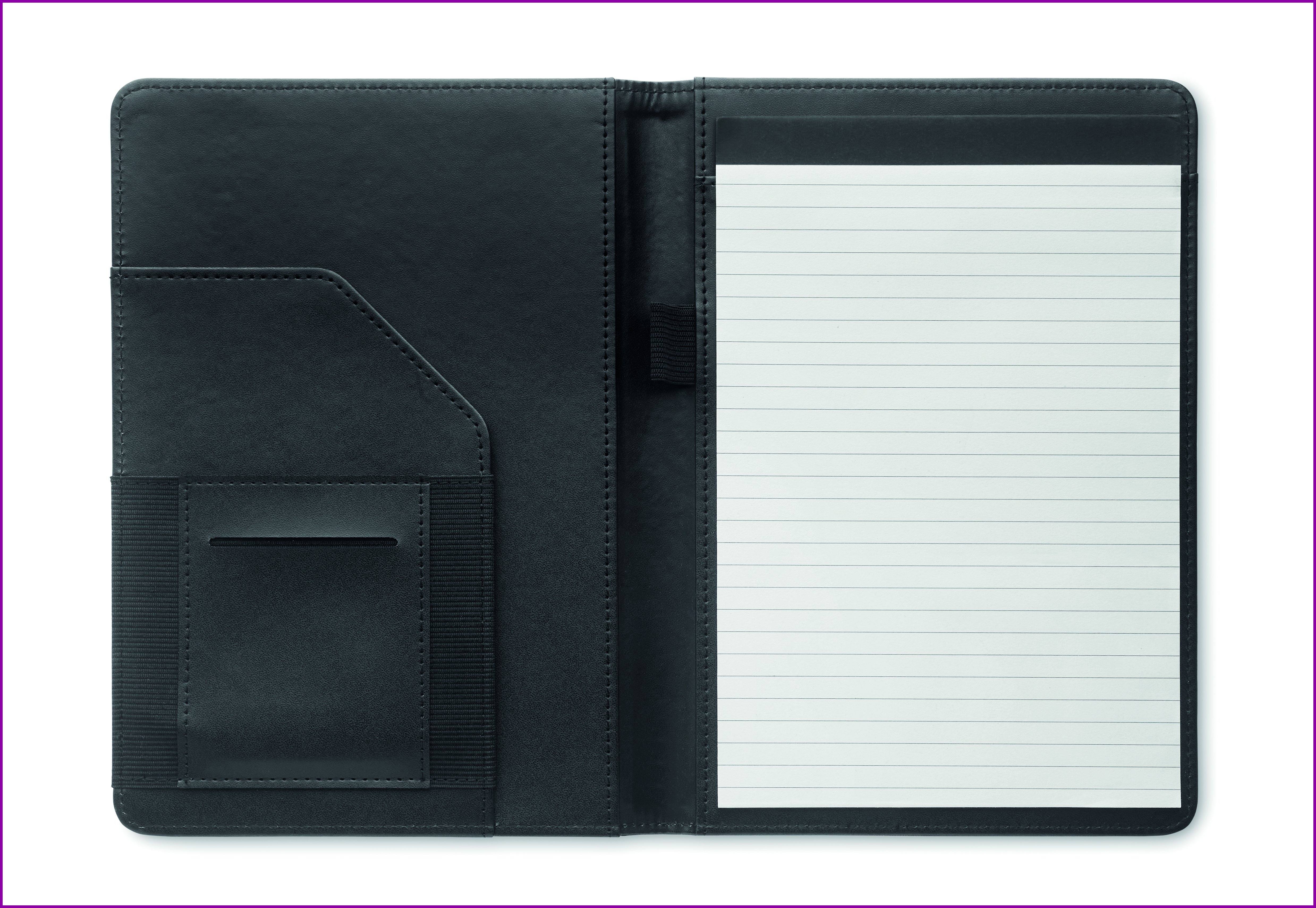 A5-salkku 2-sävyisestä 300D RPET-materiaalista. Vaihdettava A5-muistilehtiö. 40 valkoista viivoitettua bambupaperisivua (20 arkkia). Kynänpidike. Korttikotelo sisäpuolella ja yksi iso lokero.
