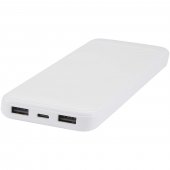 Pyydä tarjous painatuksesta tuotteseen Adhil 10 000 mAh:n ja 10 W:n kierrätetystä muovista valmistettu varavirtalähde, jossa on kaksi sisäänrakennettua kaapelia Valkoinen