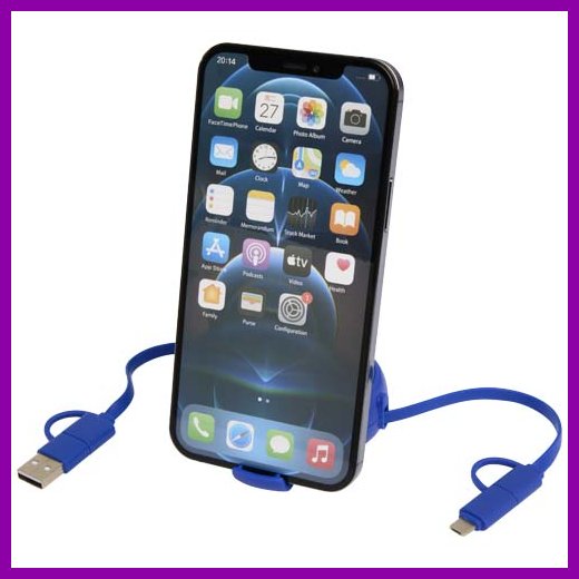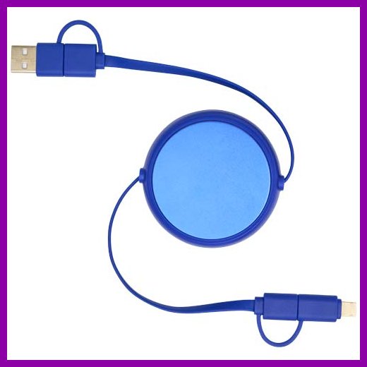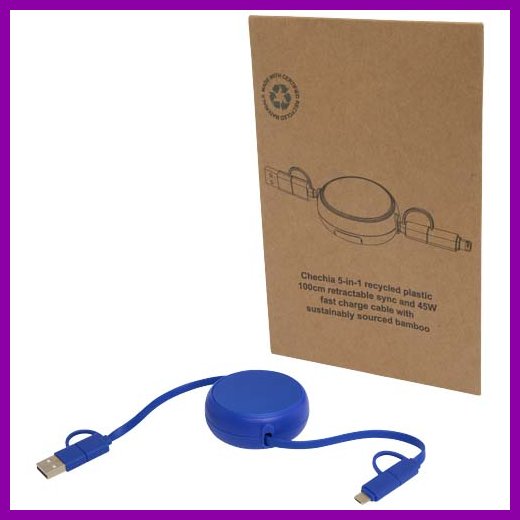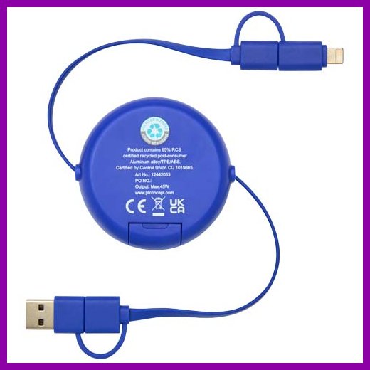 Pyydä tarjous painatuksesta tuotteseen Alasia kierrätetystä muovista ja alumiinista valmistettu sisäänvedettävä datasynkronoiva 45 W:n ja 100 cm:n 5-in-1-pikalatauskaapeli Royal sininen
