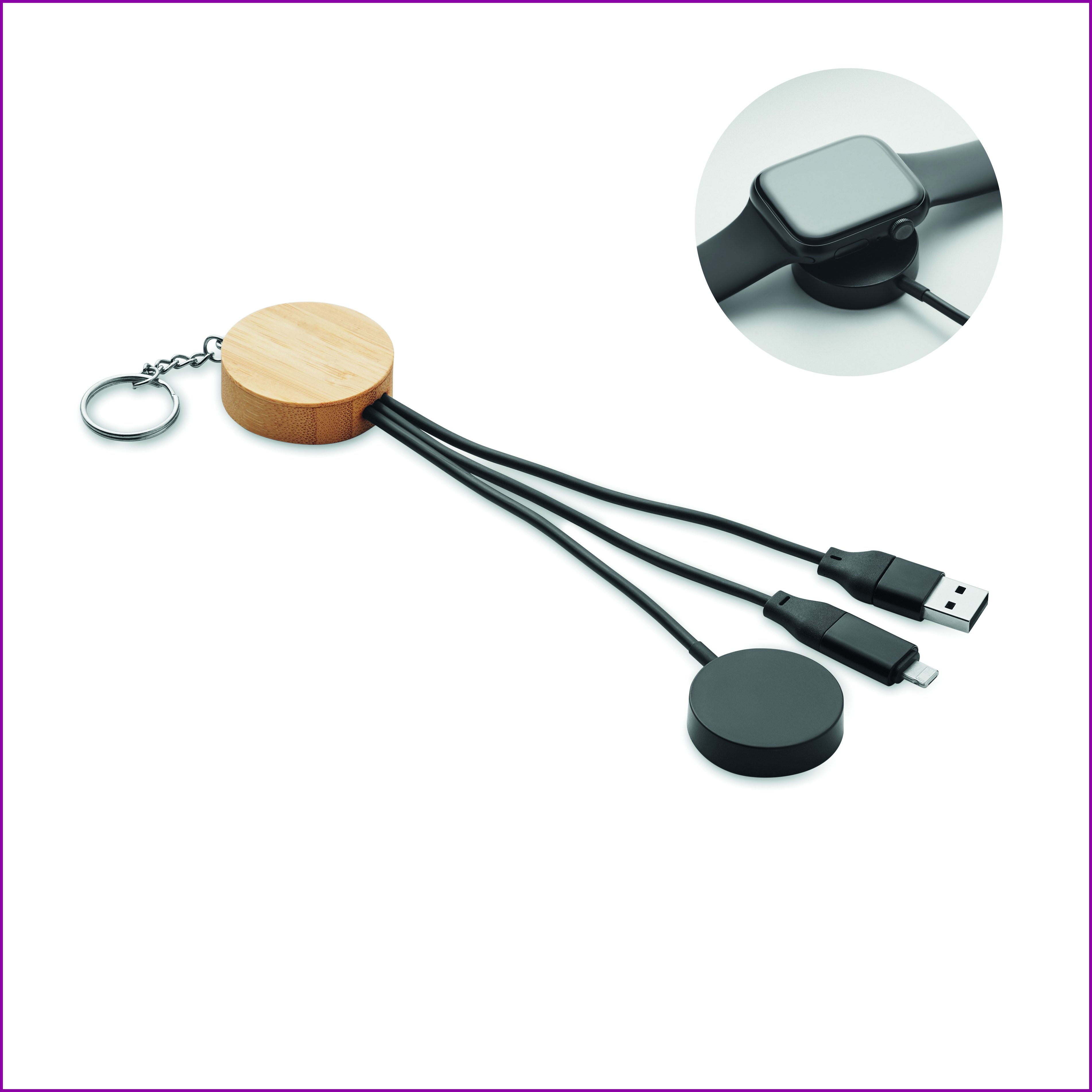 Avaimenperä 4 in 1 -latauskaapeli 60W bambu yksityiskohdilla. Tulo: 2- in-1 Type-C ja Type-A. Lähtö: Kellon lataus (Samsung® ja Apple®) , Type- C ja micro-B (2 in 1 pin).
