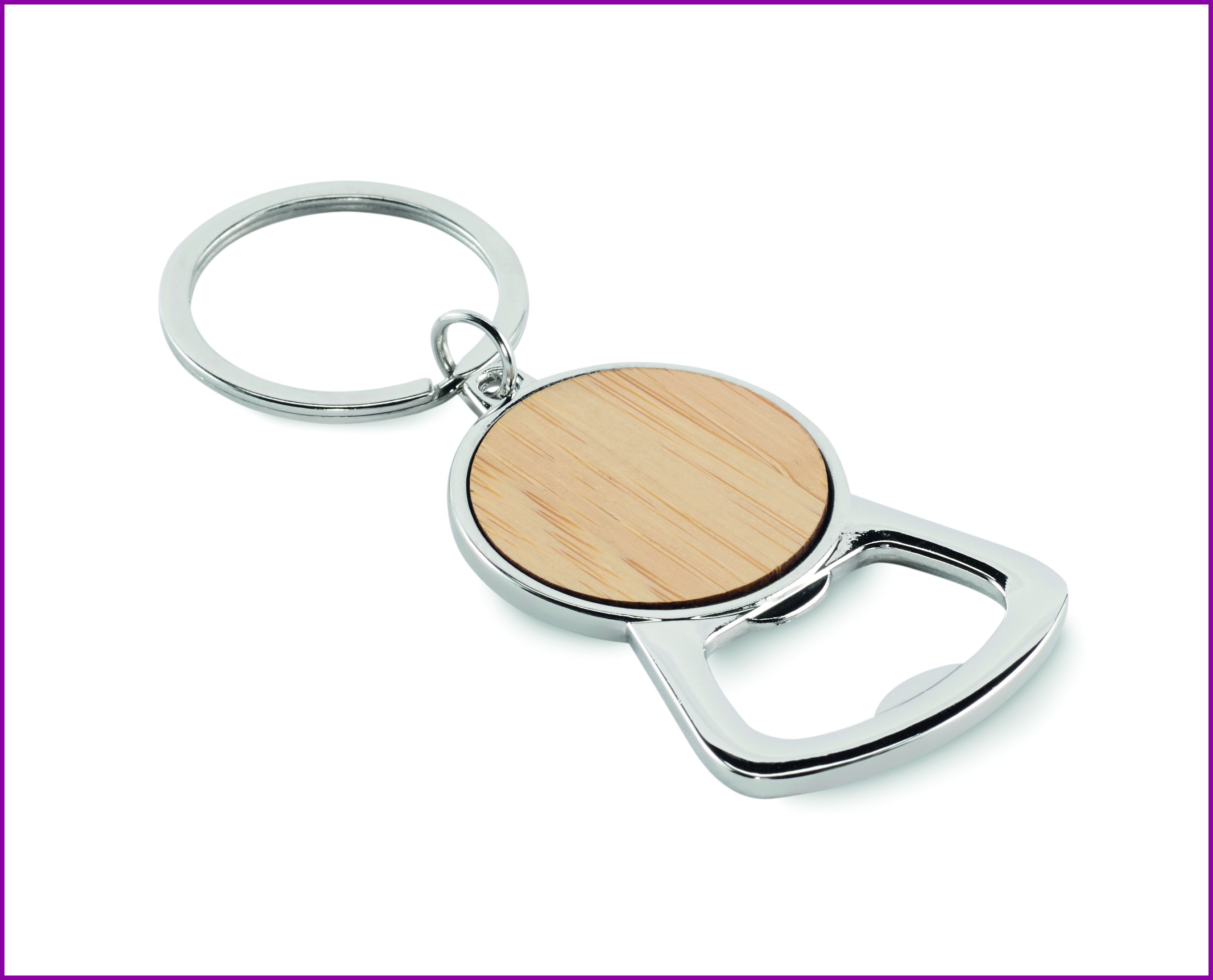 Metallinen pullonavaaja-avaimenperä, jossa on bambuyksityiskohta.