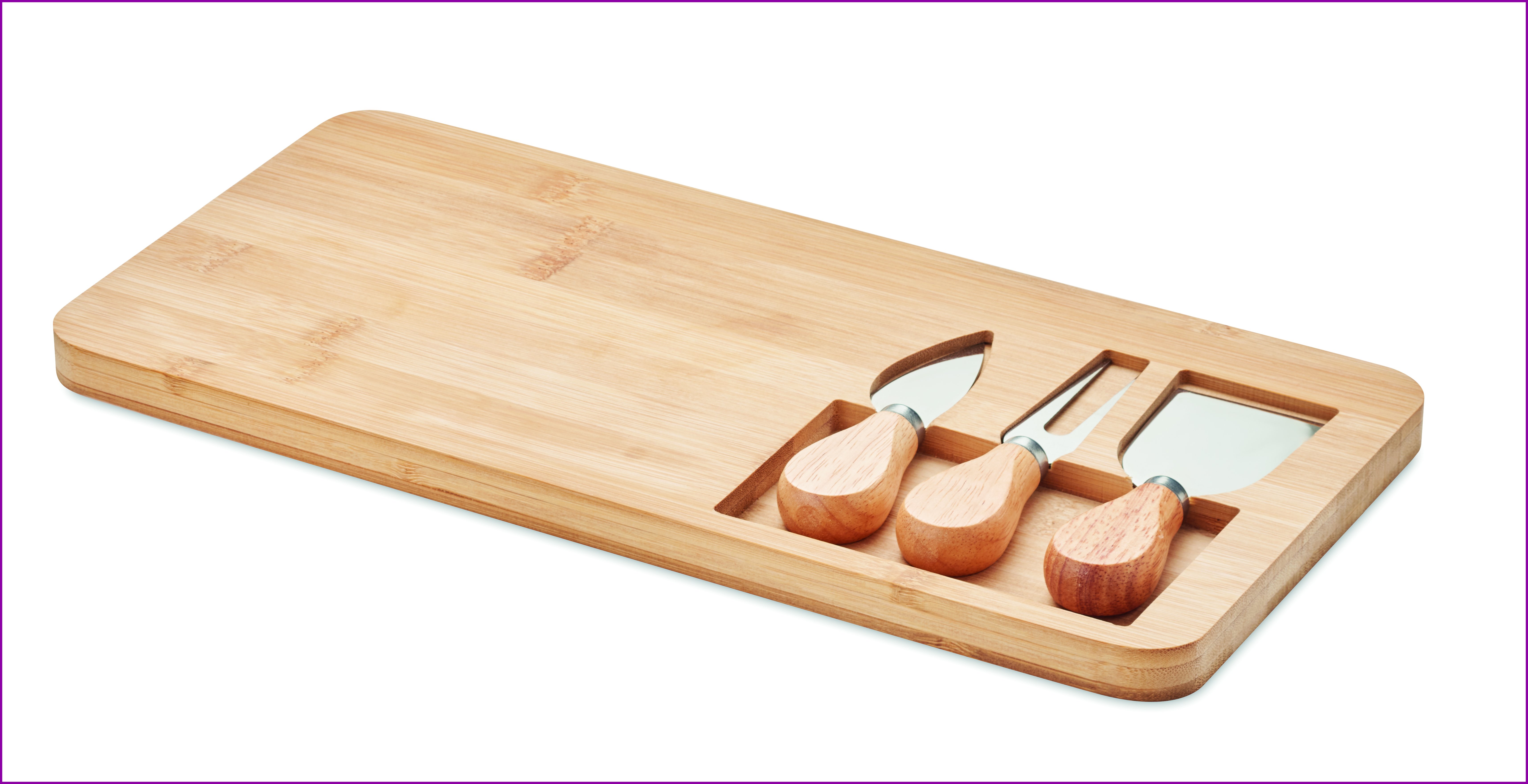 Bamboo cheese set with a serving board, 2 serving knives and a fork. Present a cheese platter in style with this natural looking wooden board and matching utensils. Can also be used to serve other types of food and snacks at parties or at a dinner. Bamboo is a natural product, there may be slight variations in colour and size per item, which can affect the final decoration outcome. FSC®-certified | FSC 100%, N5.7, FSC-C213206