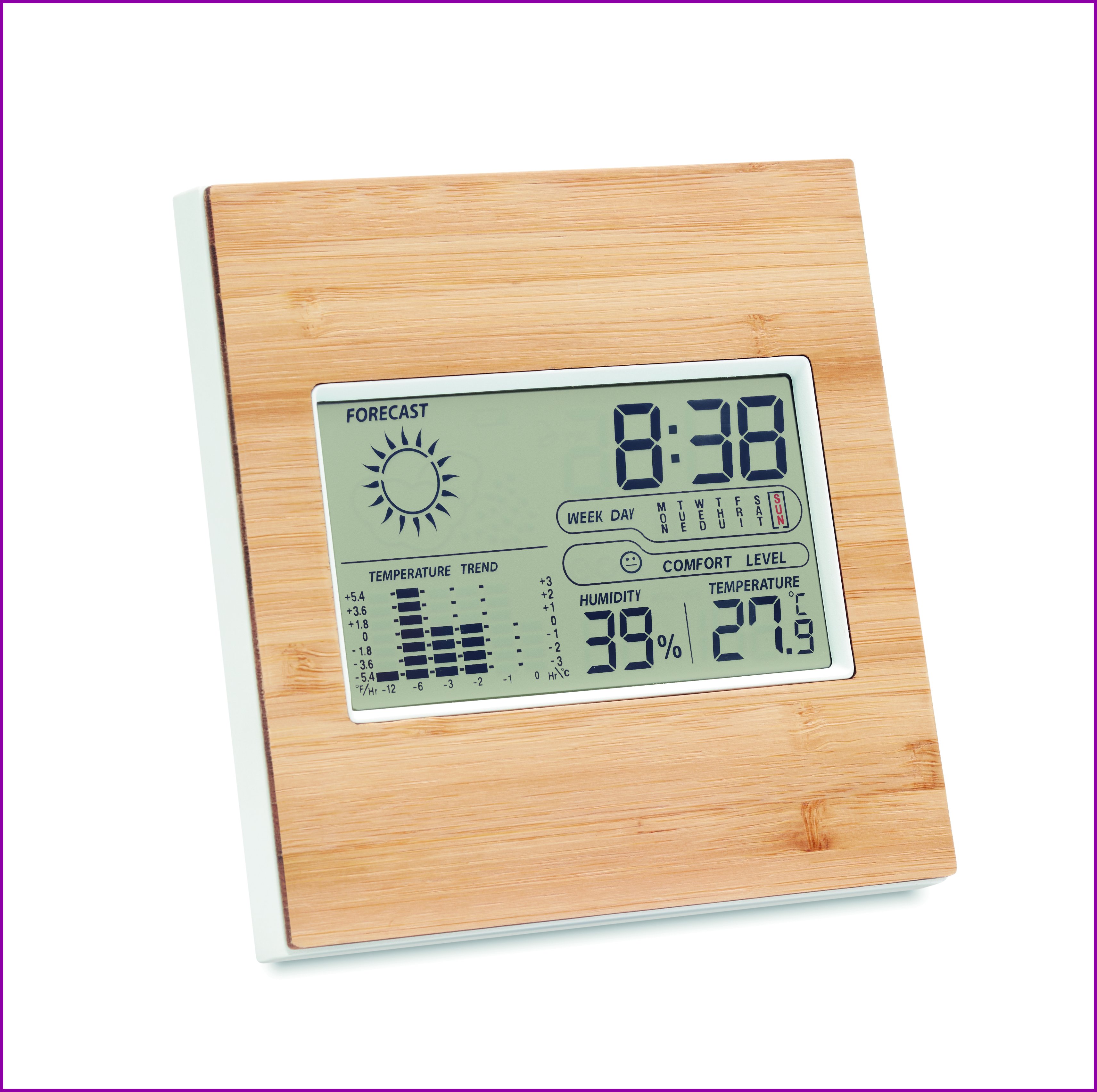 Monitoiminen sääasema bambu kuorella, sisältää ajan-, lämpötilan-, kalenterin ja kosteuden näytön. 2 AAA patteria sisältyy toimitukseen. Luonnollisen materiaalin (bambu) vuoksi, tuotteiden värissä/ koossa saattaa olla erinäisyyksiä ja tämä voi vaikuttaa painatuksen lopputulokseen.