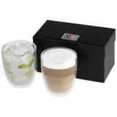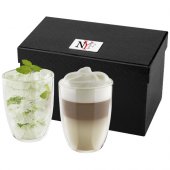 Kaksiseinäinen termoslasisetti. 290 ml. Erinomainen haluamasi latte macchiaton, jääteen tai muun kylmän tai kuuman juoman tarjoiluun. Saatavana ylellisessä lahjalaatikossa. Mukana logolaatta.