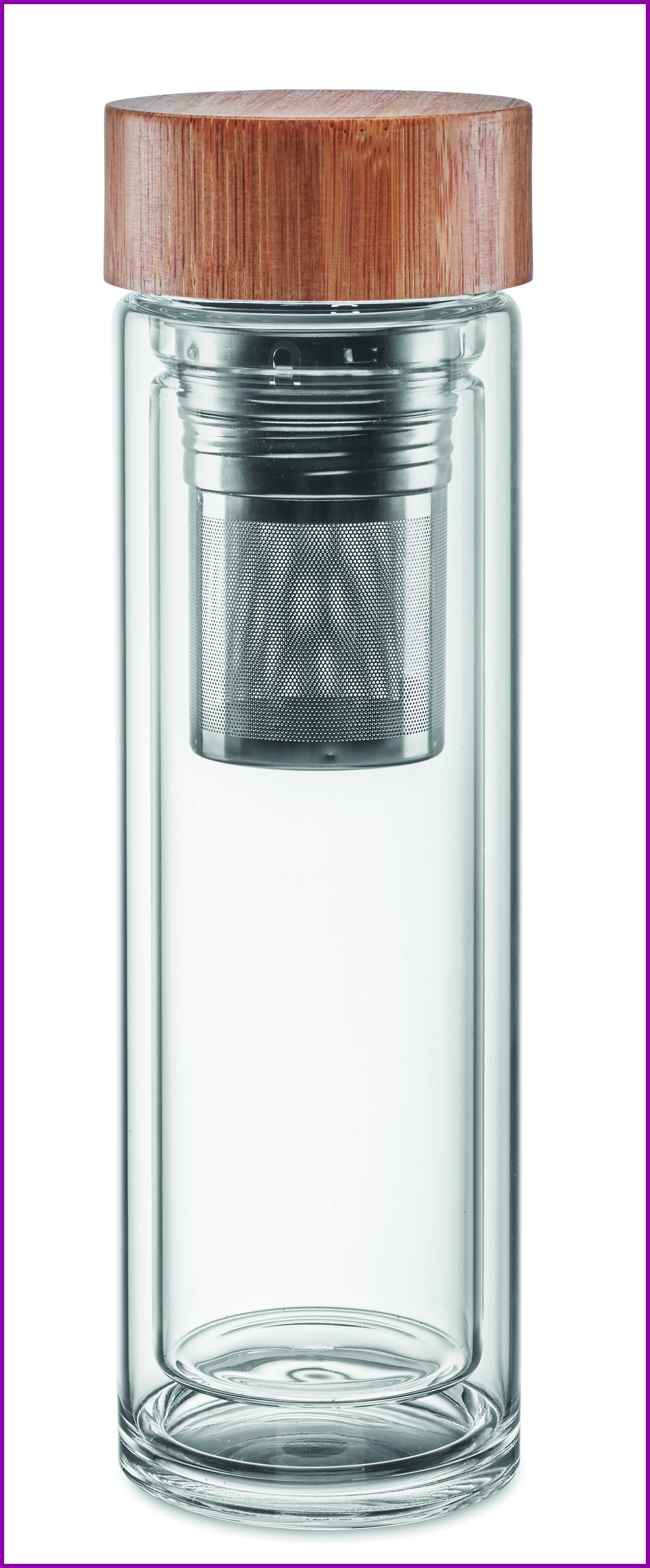 Kaksiseinäinen korkea 400 ml borosilikaattilasipullo ja bambukansi teesiivilällä. Luonnollisen materiaalin (bambu) vuoksi, tuotteiden värissä/ koossa saattaa olla erinäisyyksiä ja tämä voi vaikuttaa painatuksen lopputulokseen. Borosilikaattilasiin ei voi kaiverruttaa.