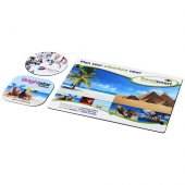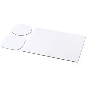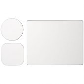 Mukana Brite-Mat-hiirimatto ja setti vastaavia lasinalusia. Settiin kuuluu suorakaiteenmuotoinen hiirimatto (0,3 x 19 x 21 cm), neliönmuotoinen lasinalus (0,3 x 9,5 x 9,5 cm) ja pyöreä lasinalus (0,3 x ø9,5cm).Värit ja Koot