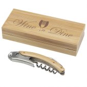 Ruostumattomasta teräksestä valmistettu tarjoilijan veitsi, joka on varustettu korkkiruuvilla ja sisäänvedettävällä folionavausveitsellä. Kahvassa on luonnollista bambua. Rasiassa käytetty bambu on hankittu ja valmistettu kestävän kehityksen standardien mukaisesti.Värit ja Koot