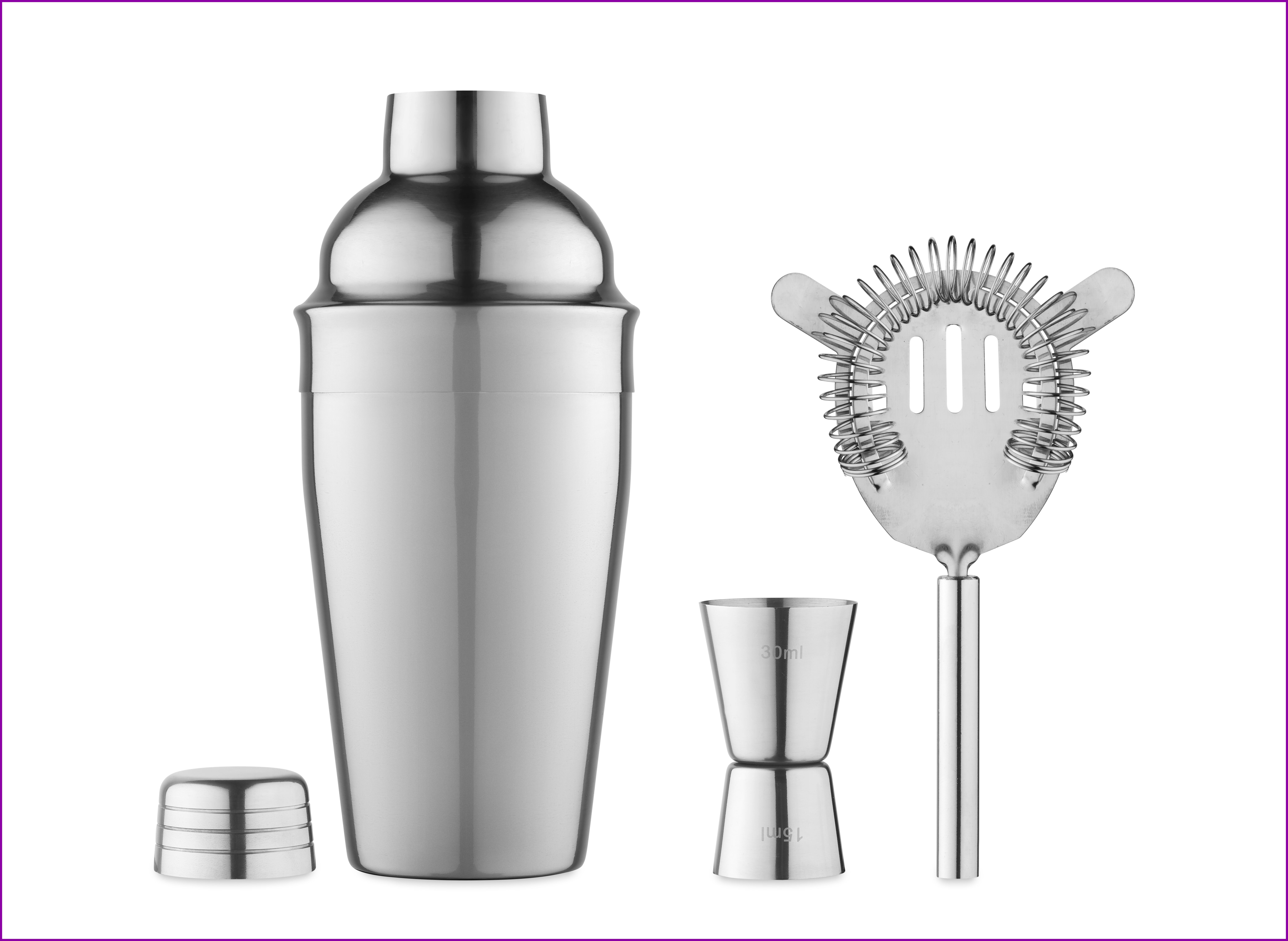 Cocktailsetti ruostumattomasta teräksestä, sisältää 500ml cocktailravistin, -jiggerin ja siivilän.
