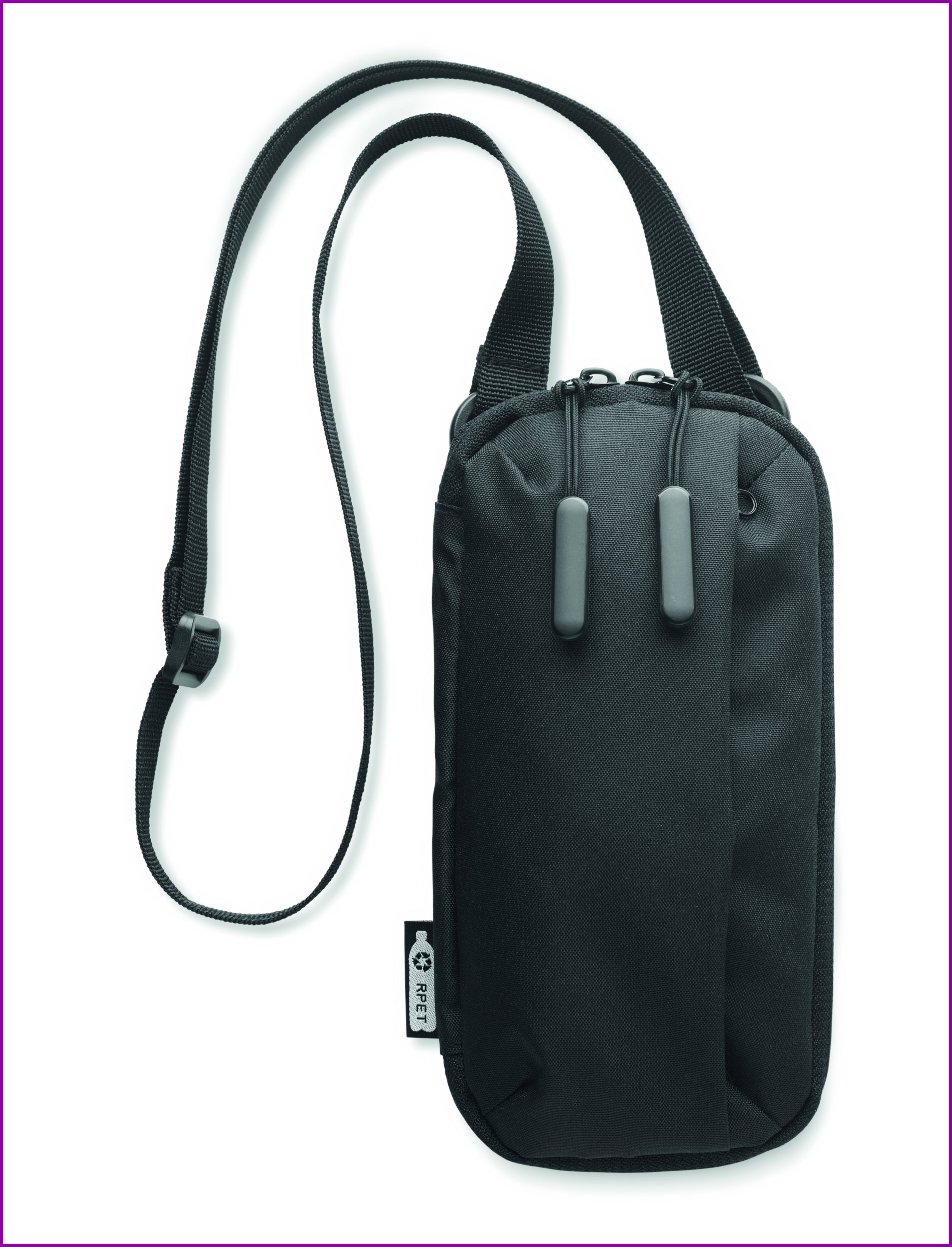 Yliolanlaukku puhelimelle 300D RPET polyesteristä, säädettävällä hihnall. Vetoketjullinen etu- ja sivutasku. sekä useita muita taskuja.