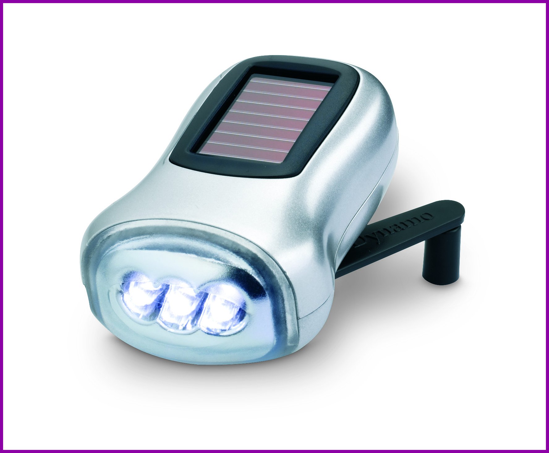 "Taskulamppu, jota voi ladata sekä aurinkopaneelilla että dynamolla. Varustettu 40 mAh akulla. ABS-muovinen runko, satiinihopeinen pinnoitus."
