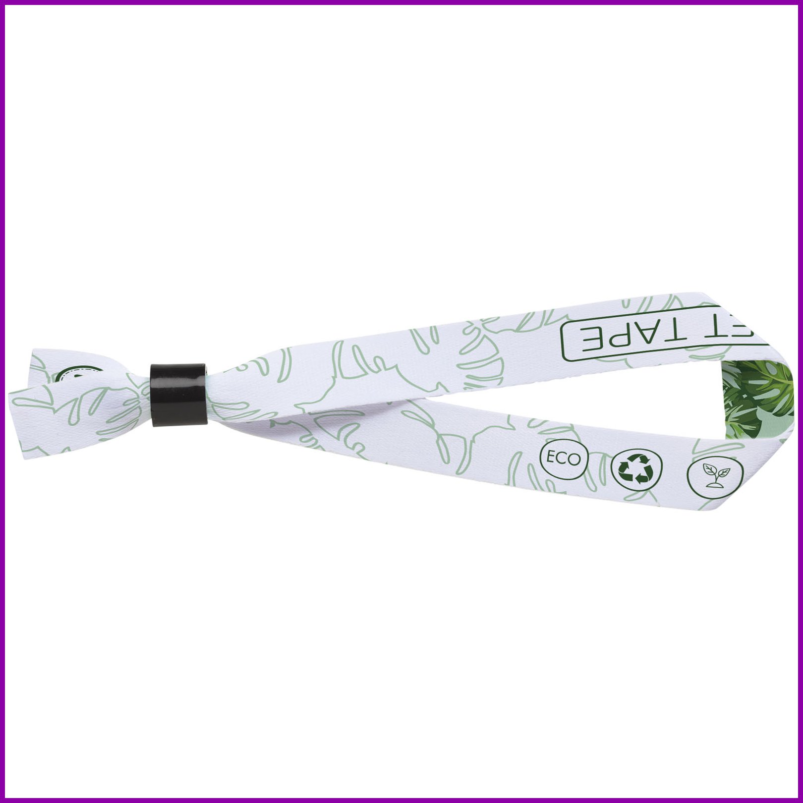 Kierrätetystä RPET-muovista tehty festivaaliranneke RPET-muovisella turvalukolla. Painatus saatavilla yhdelle tai kahdelle puolelle. Jos valitset painatuksen molemmille puolille nauhaa, logo voidaa painaa alapuolelle standardin mukaisesti juoksevana tai sovittaa samaan kohtaan molemmille puolille (fitted). Kertakäyttöinen, täydellinen festivaaleille ja tapahtumiin.