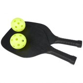 Tämä poppelipuusta valmistettu mailasetti tarjoaa kahdelle paljon hauskaa liikuntaa rannalla, puistossa tai puutarhassa. Mailat ovat kooltaan 40 x 20 x 0,7 cm ja ne on maalattu mustaksi, mikä tarjoaa suuren pinnan logon painatusta varten. Kahvat on päällystetty PU-teipillä, joka antaa maksimaalisen pidon intensiivisen pelin aikana. Setin täydentää kaksi PP-materiaalista valmistettua palloa. Pakattu 45 x 26 cm:n kokoiseen verkkokankaiseen polyesteripussiin. Varoitus! Ei sovellu alle kolmevuotiaille lapsille. Pieniä osia. Tukehtumisvaara.