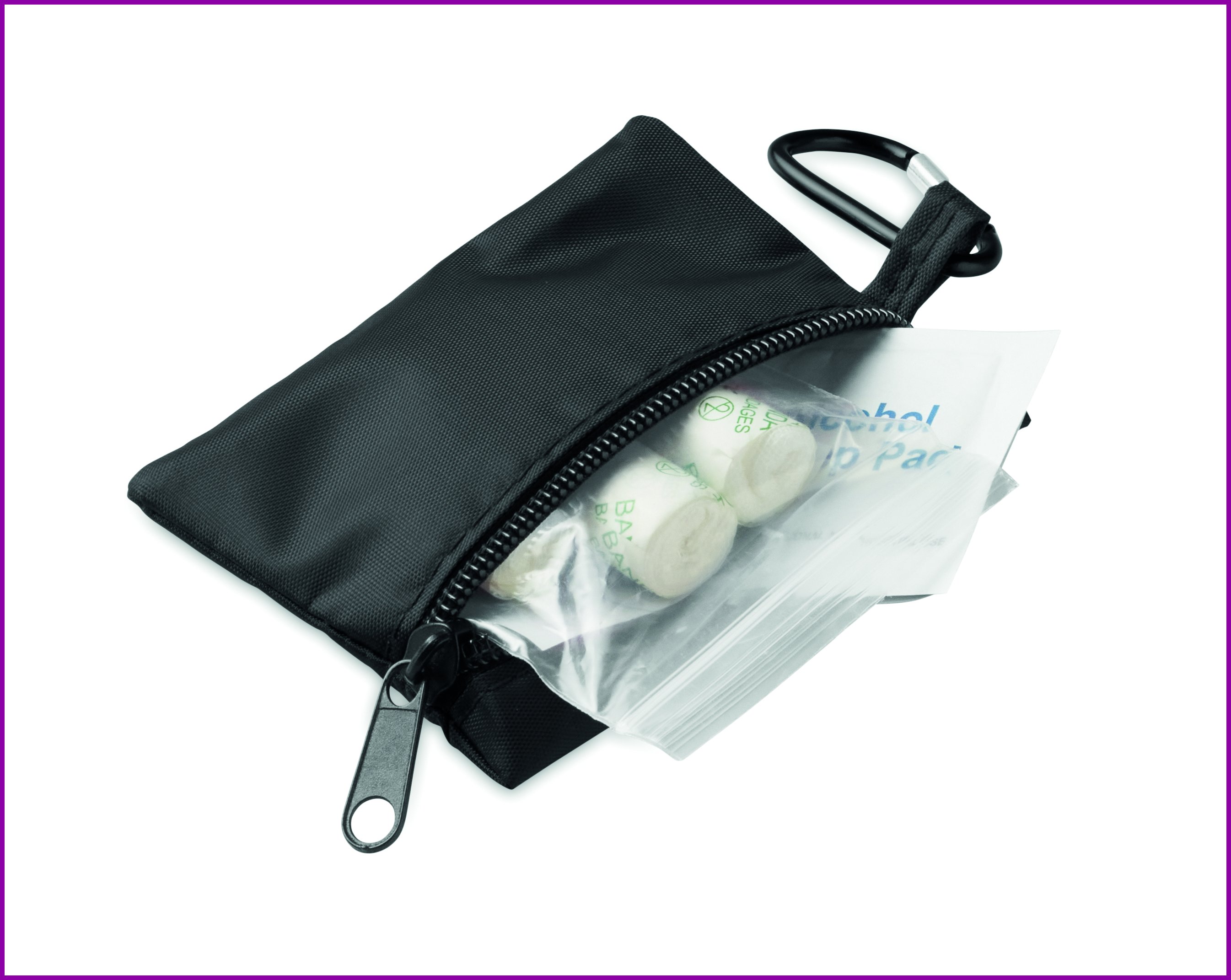 Kompakti ensiapupakkaus RPET-pussissa, jossa alumiininen sulkurengas. Sisältää 4 alkoholipyyhettä, 3 laastaria, 2 sidettä, 2 sideharsoa, 1 teipin ja 1 sakset. Ei saatavilla EU:n ulkopuolella.