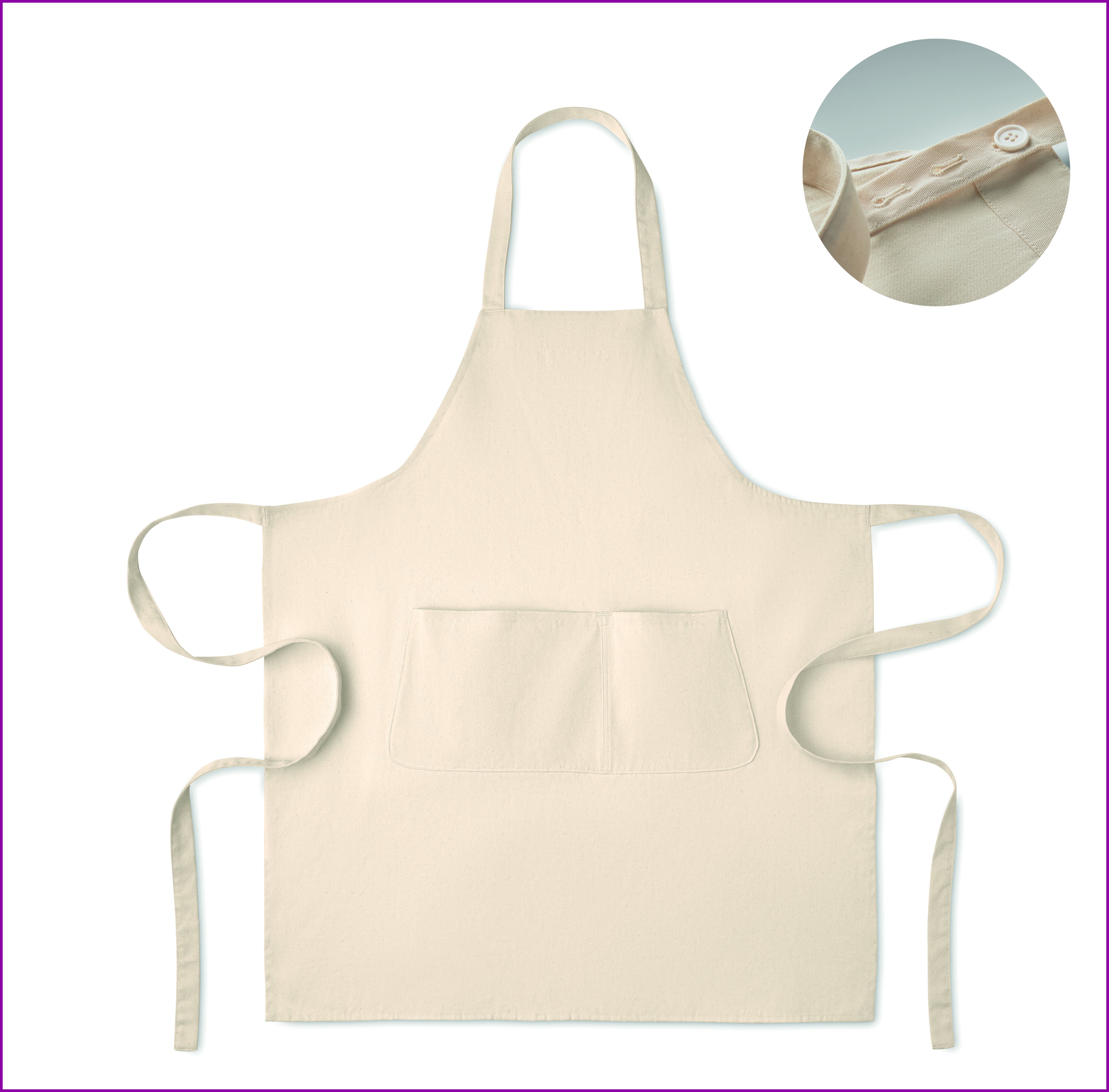 Säädettävä esiliina, jossa yksi suuri etutasku ja kaksi lokeroa. Valmistettu 240 g/m² luomupuuvillasta. Kaulanauhassa säädettävä nappi.