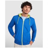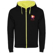 Verryttelytakki harjaamattomasta fleecestä kirkkaanvärisillä koristeluilla. Keskellä vetoketju kontrastivärisellä vetimellä. Hupussa kirkkaan kontrastivärinen vuori mikroperforoidusta polyesterikankaasta. Kiristysnyöri ja kirkkaan kontrastiväriset metalliset lenkit. 1x1-resori hihansuissa ja vyötäröllä. Kaksi etutaskua leveällä reunuksella. Kauluksen sisäpuolella vahvistetut koristesaumat. Irrotettava etiketti.Värit ja Koot