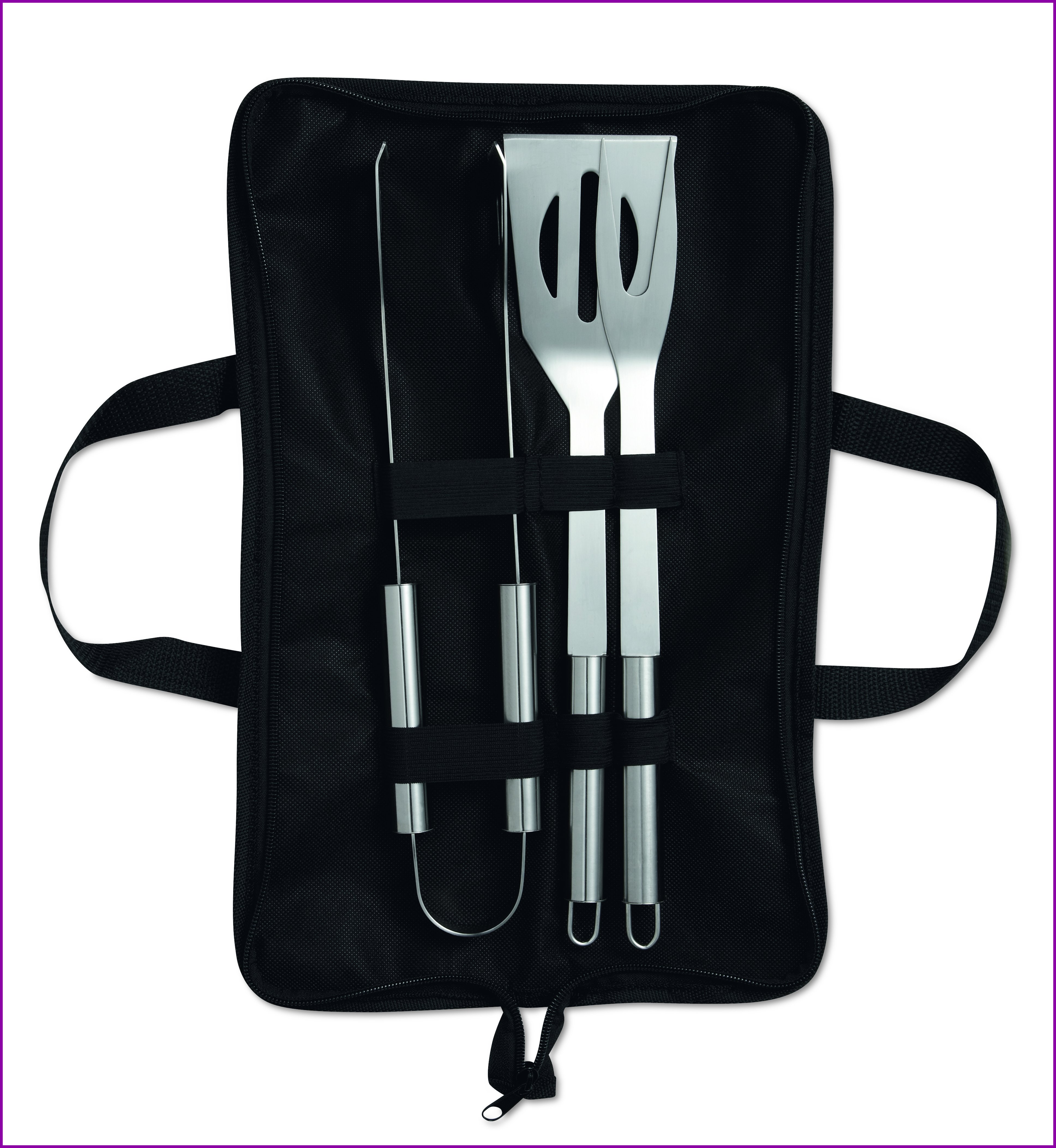 Kolme ruostumattomasta teräksestä valmistettua grilli atulaa, pakattuna vetoketjulliseen kuitukangaspussiin.
