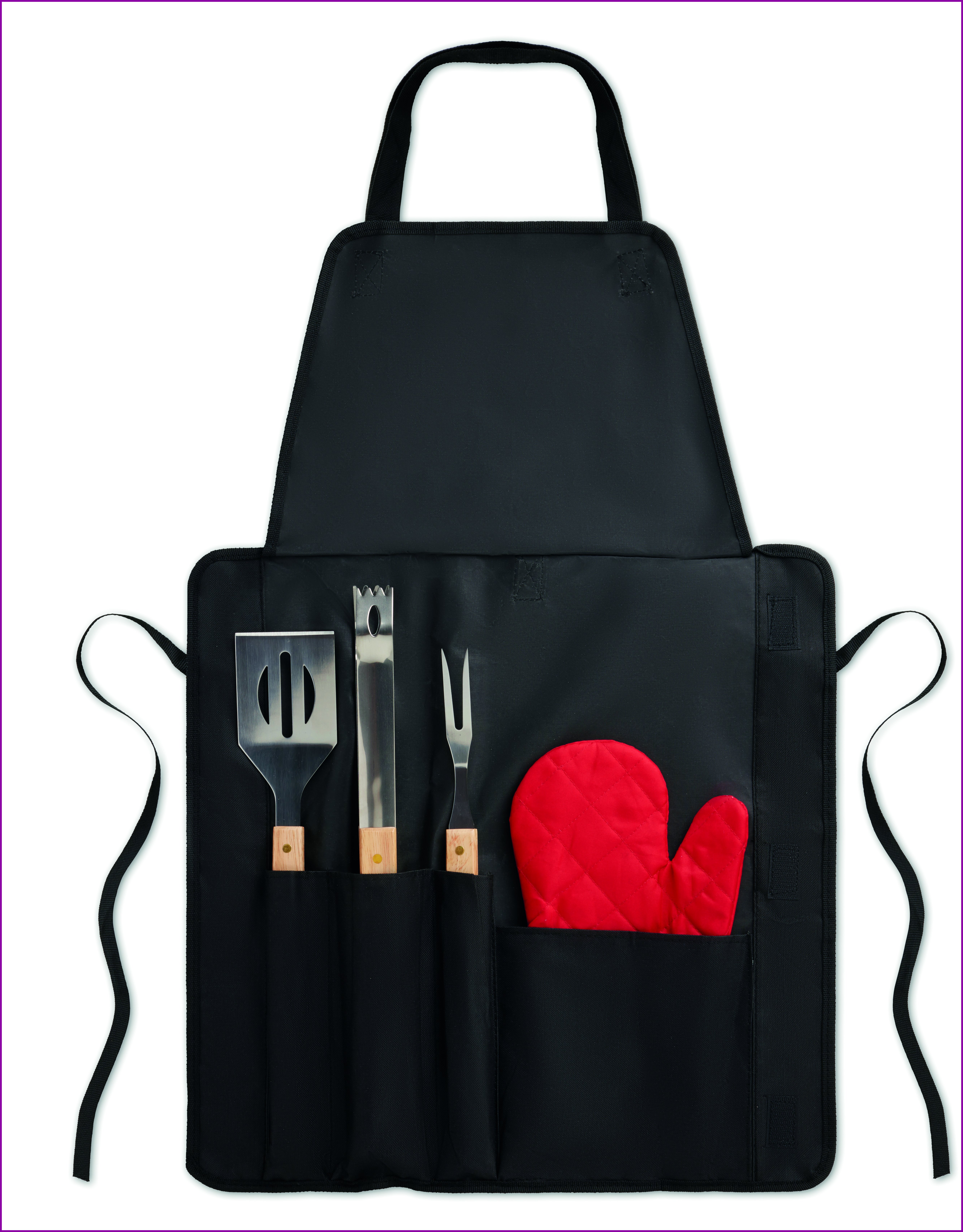600D polyesterinen esiliina grillisetti, sisältää 3 erilaista grillaus välinettä.