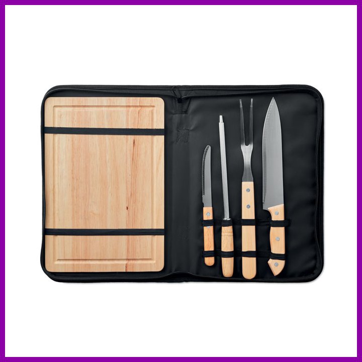 Neljä ruostumattomasta teräksestä valmistettua grillauslisävarustetta ja leikkuulauta polyesteripussissa. Sisältää lihaveitsen, veitsen, leikkuuhaarukan ja teroituspuikon. Luonnollisen materiaalin (bambu) vuoksi, tuotteiden värissä/ koossa saattaa olla erinäisyyksiä ja tämä voi vaikuttaa painatuksen lopputulokseen.