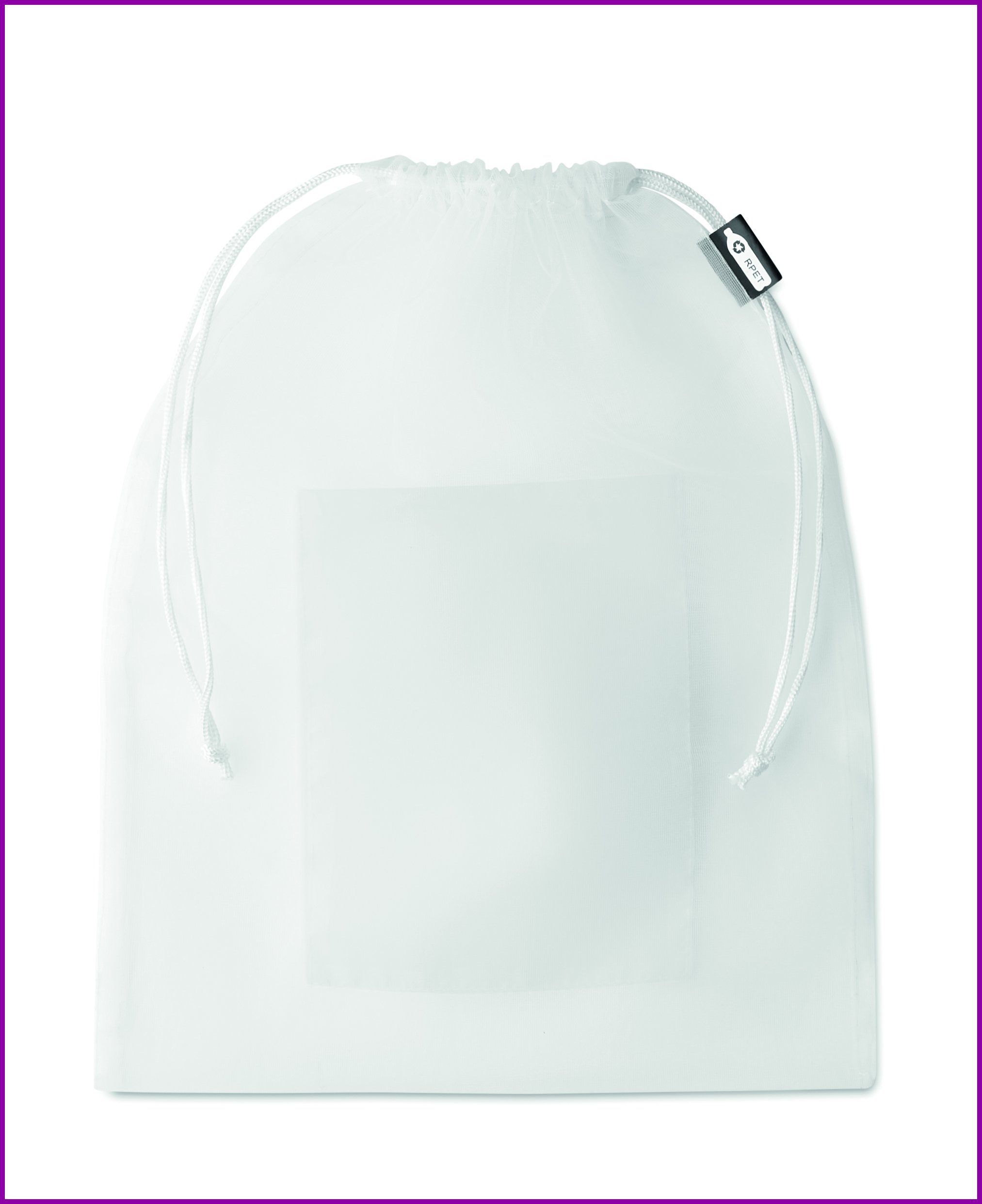 RPET verkko hedelmäpussi PP naruilla ja etutaskulla.