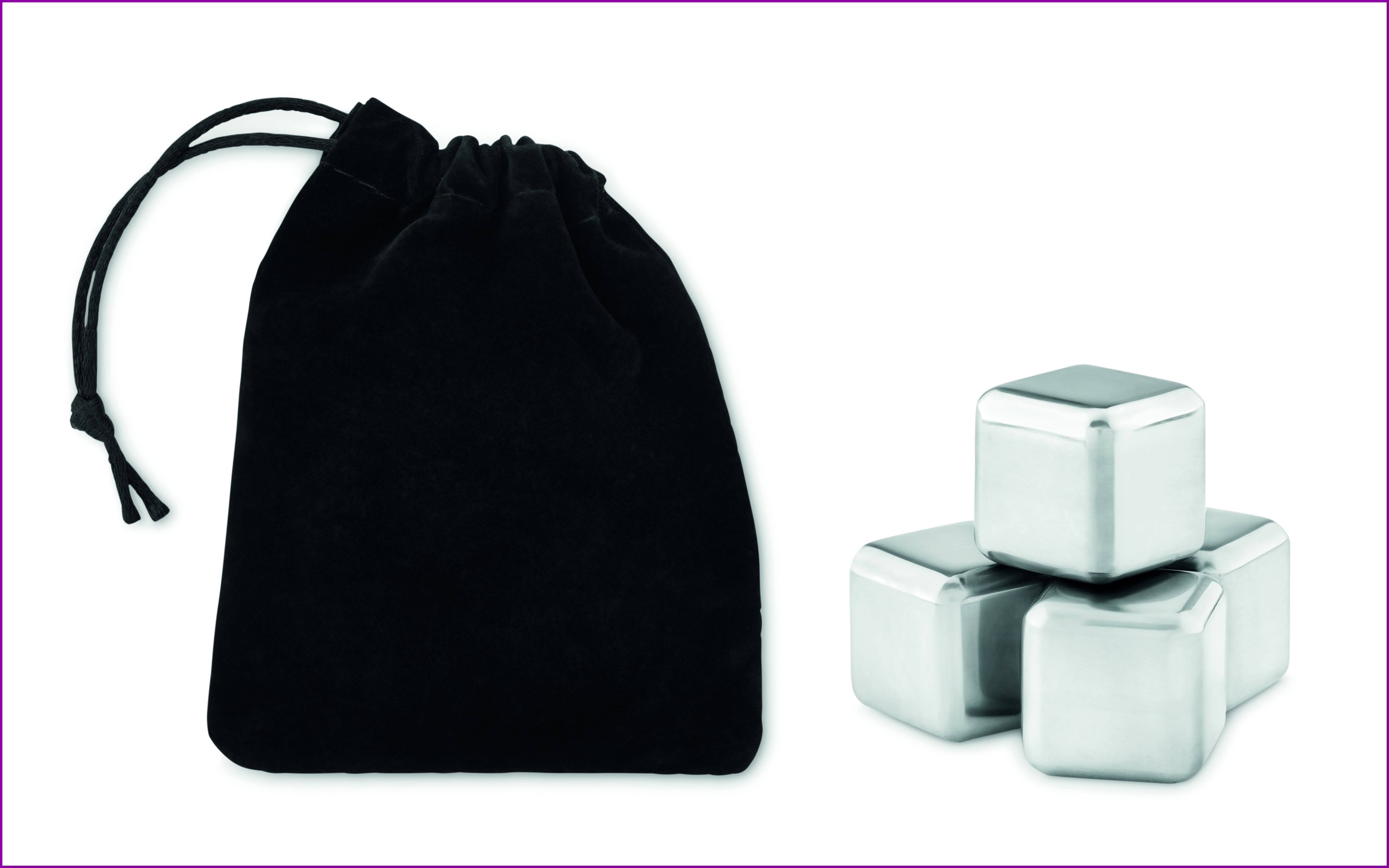 4 ruostumattomasta teräksestä valmistettua jääpalaa samettipussissa.