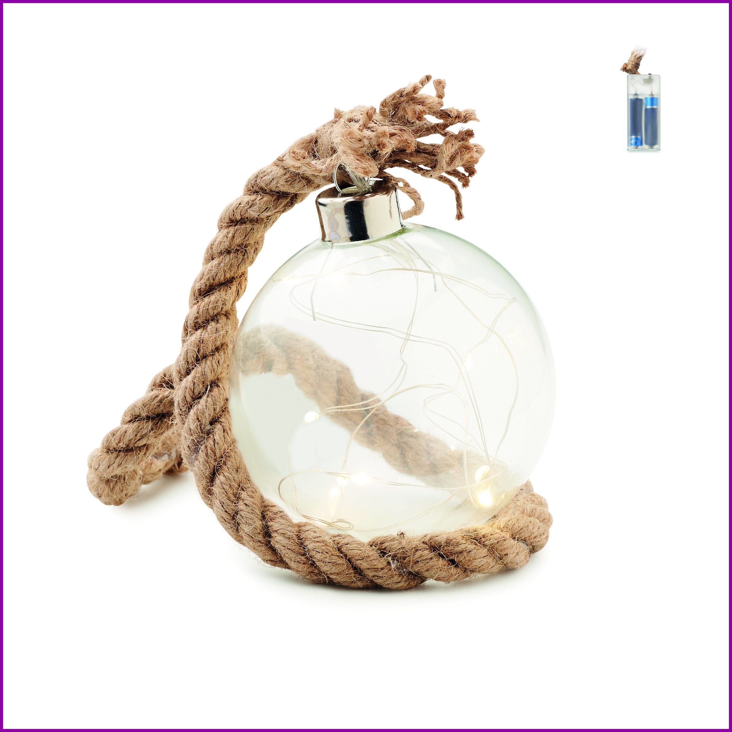 Lasinen joulupallo juuttinarulla ja 8 lämpimällä LED-valolla. 2 AA patteria ei sisälly toimitukseen.