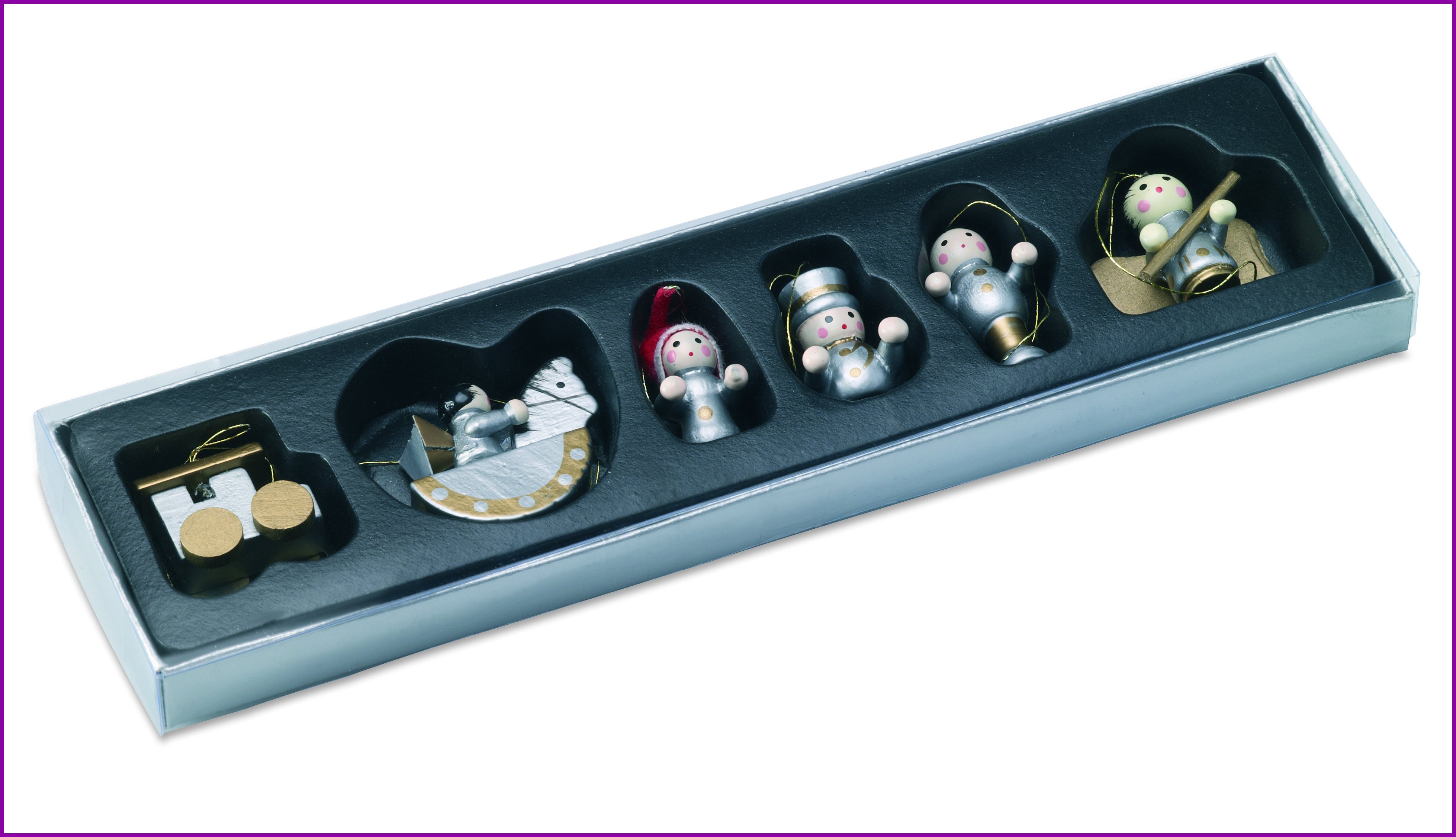 6 kpl joulukoristesetti, pakattuna kartonkiseen laatikkoon läpinäkyvällä kannella.