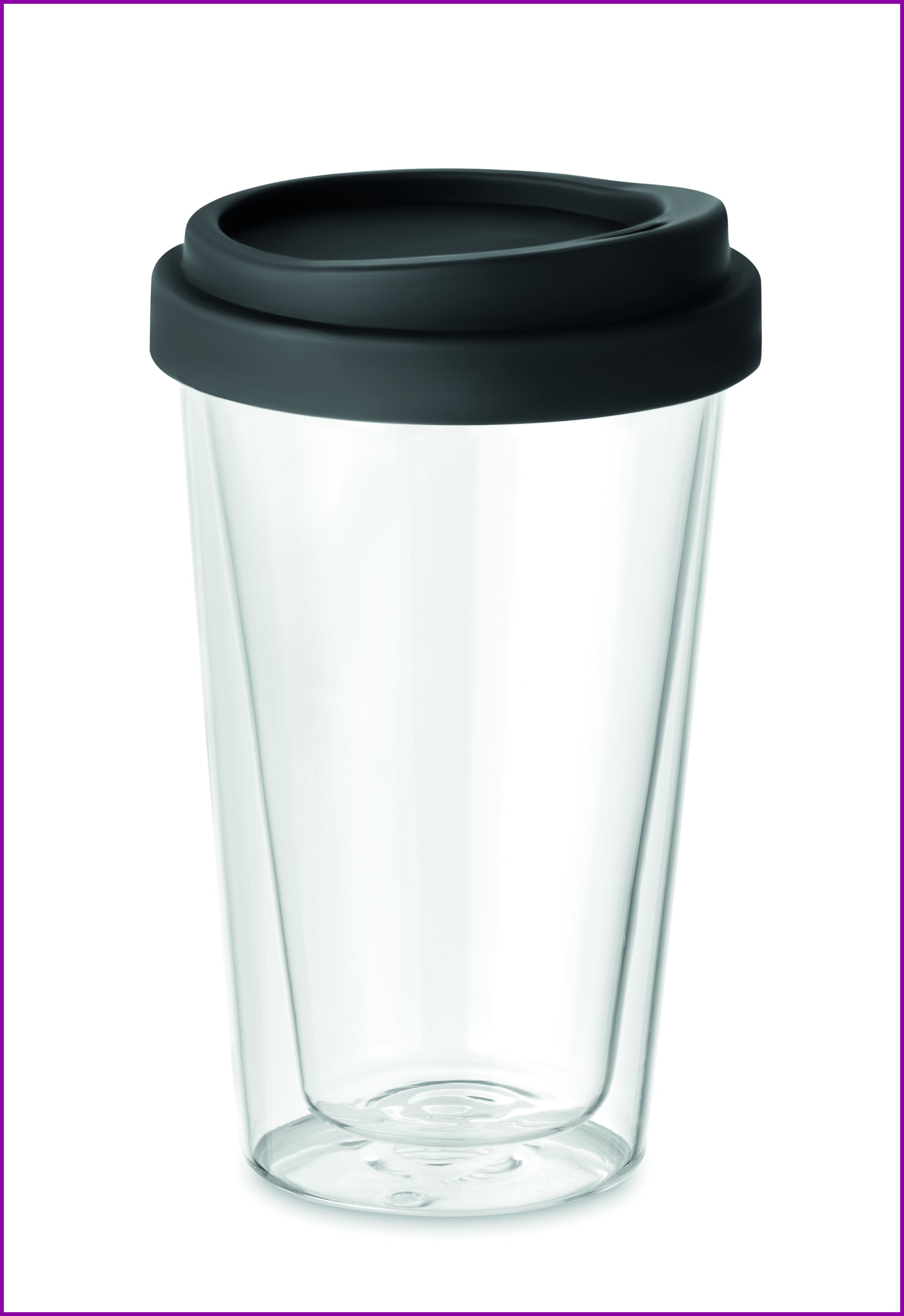 Kaksiseinäinen 350 ml borosilikaatti juomalasi, silikonisella kannella.