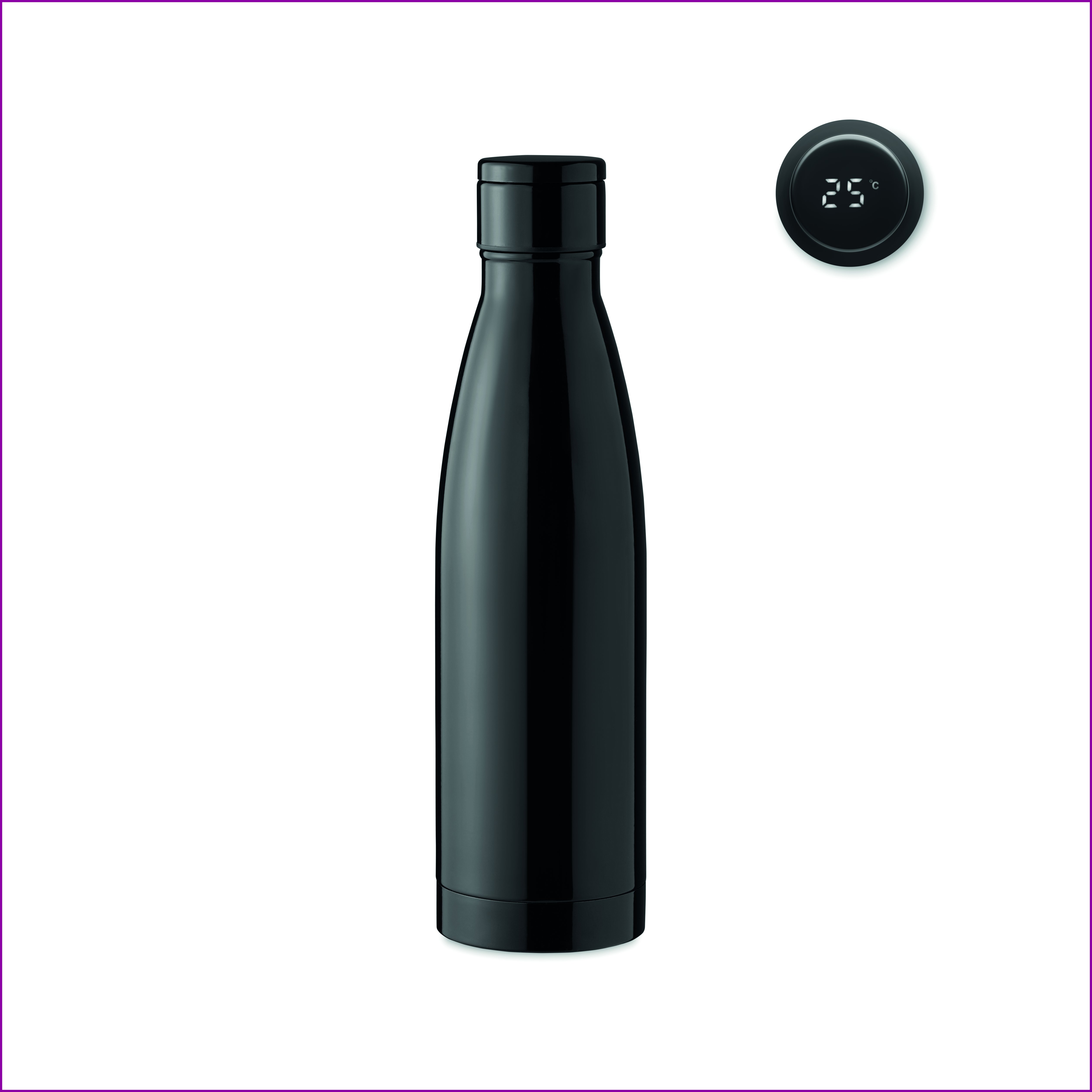 Kaksiseinäinen ruostumattomasta teräksestä valmistettu termospullo. Kannen yläosaan on integroitu LED-kosketuslämpömittari. Mukana on yksi ladattava CR 2032 -paristo. Tilavuus 500 ml. Vuotamaton.