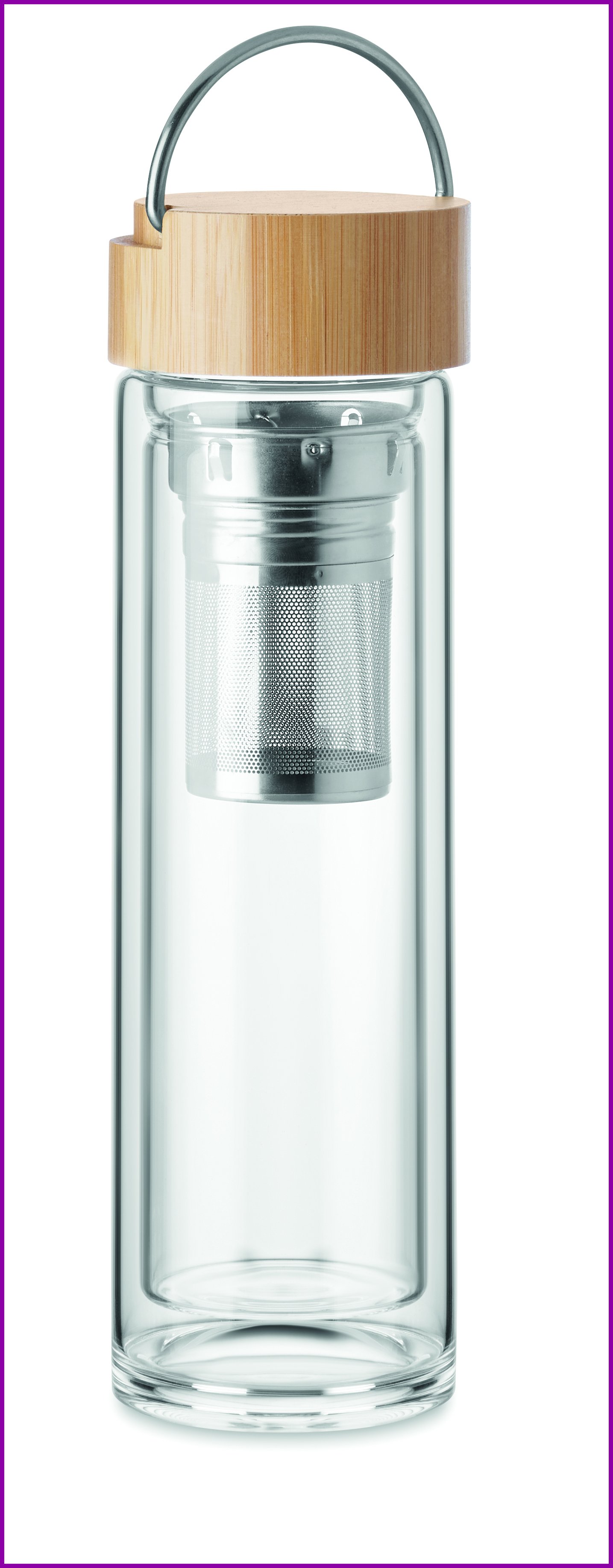 Kaksiseinäinen borosilikaattilasista valmistettu pullo, jossa on bambukansi ja teesihvilä. Tilavuus 400 ml.