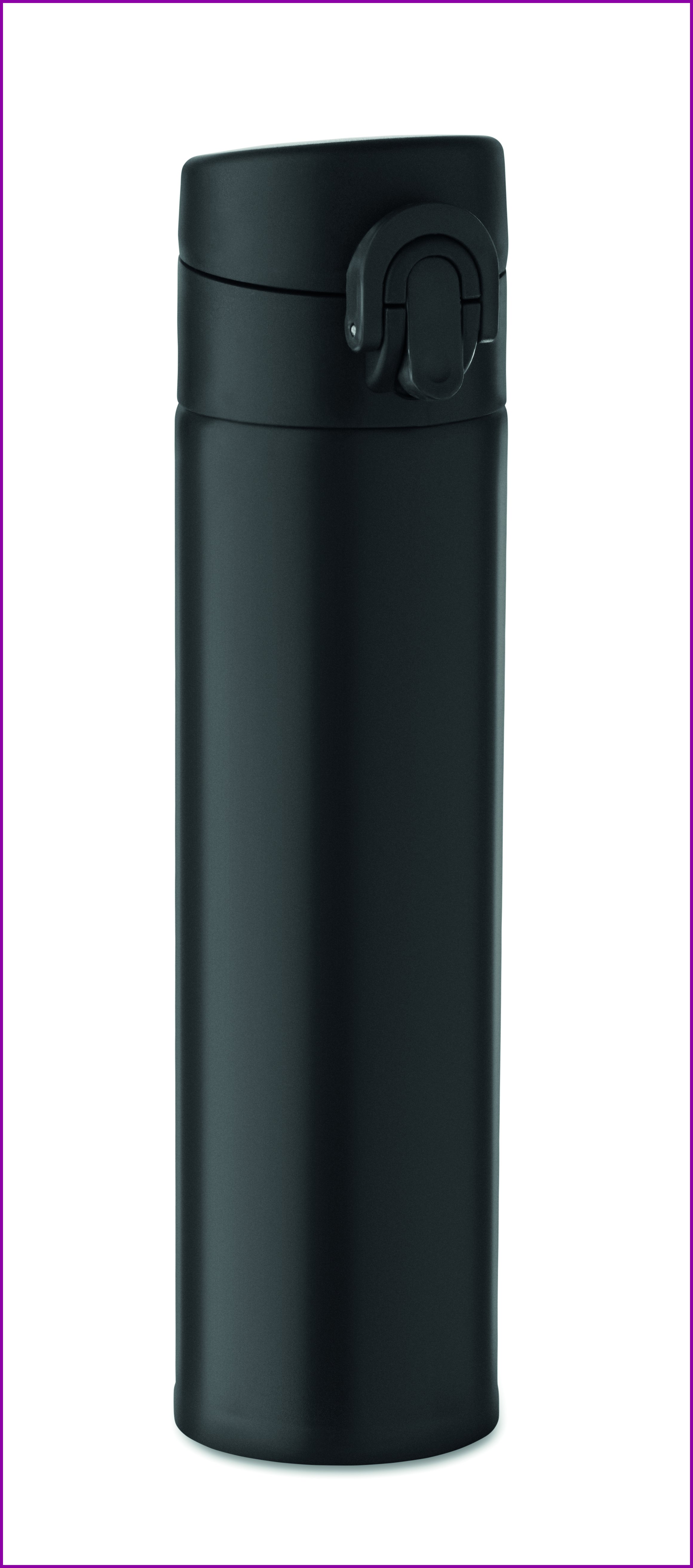 Kaksinkertainen juomapullo kierrätetystä ruostumattomasta teräksestä (90 % kierrätettyä ruostumatonta terästä ja 10 % ruostumatonta terästä), jossa on turvalukko kannessa ja painamalla avattava vaihtoehto. Vuotamaton. Tilavuus: 300 ml.