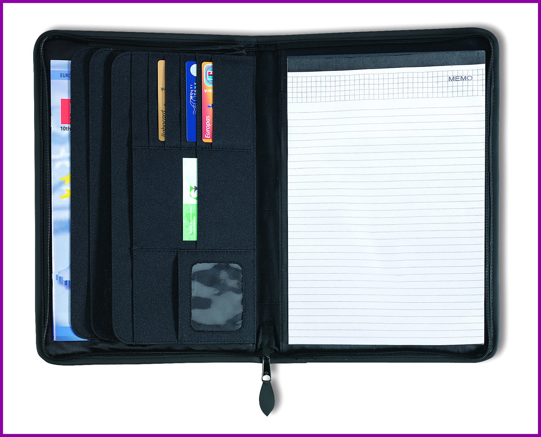 210T vuorattu 600D polyesterinen A4 kansio vetoketjulla, 4 lokeroa ja korttitaskut. Sisältää 20 sivuisen muistilehtiön.
